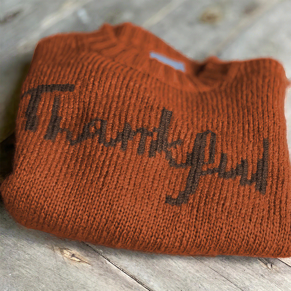 "My Thankful sweater for Thanksgiving arrived and I love it. Warm and just enough fuzzy."