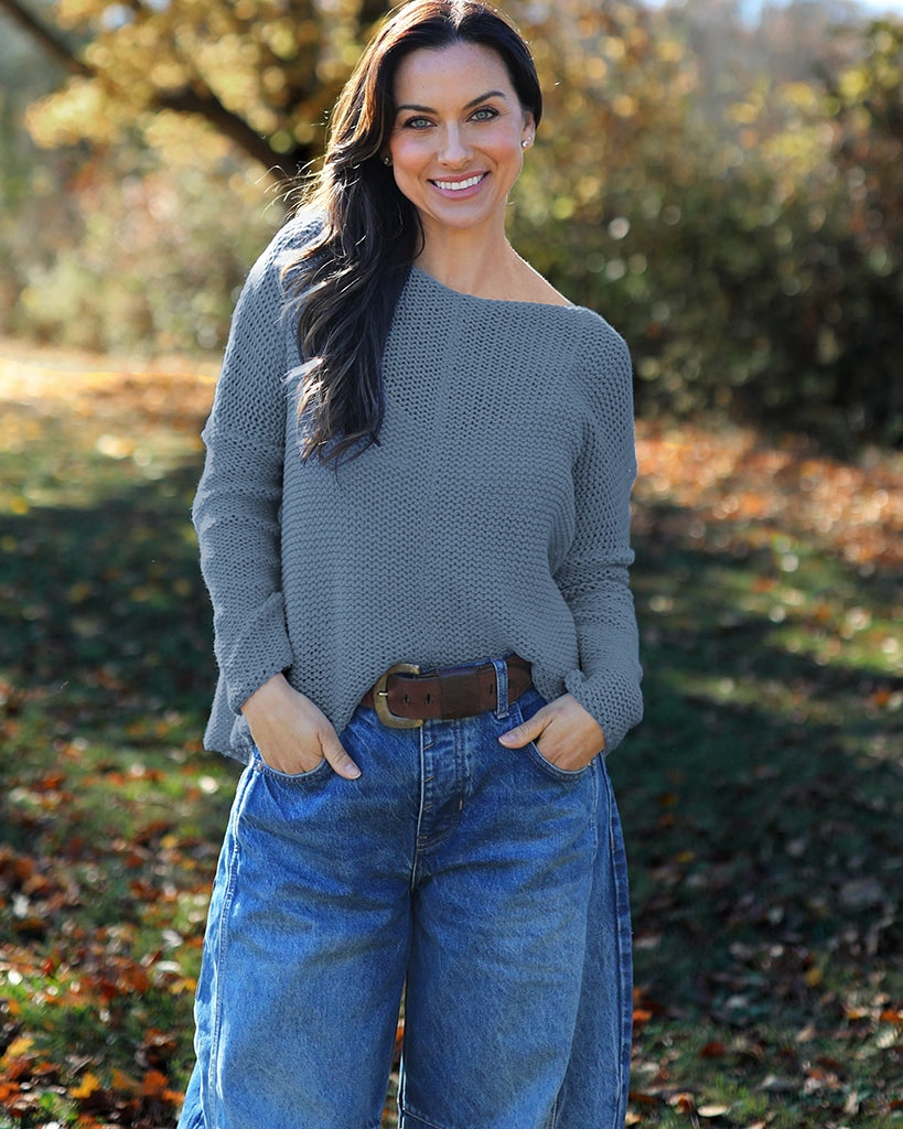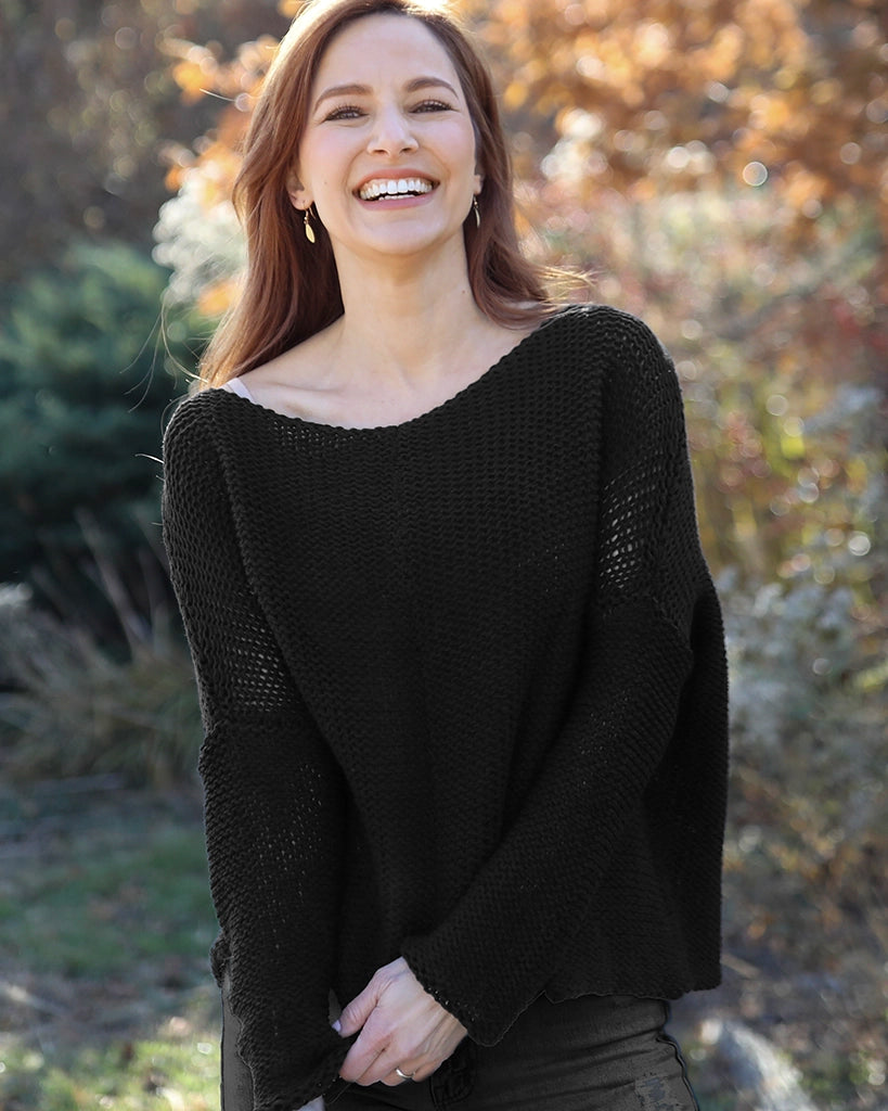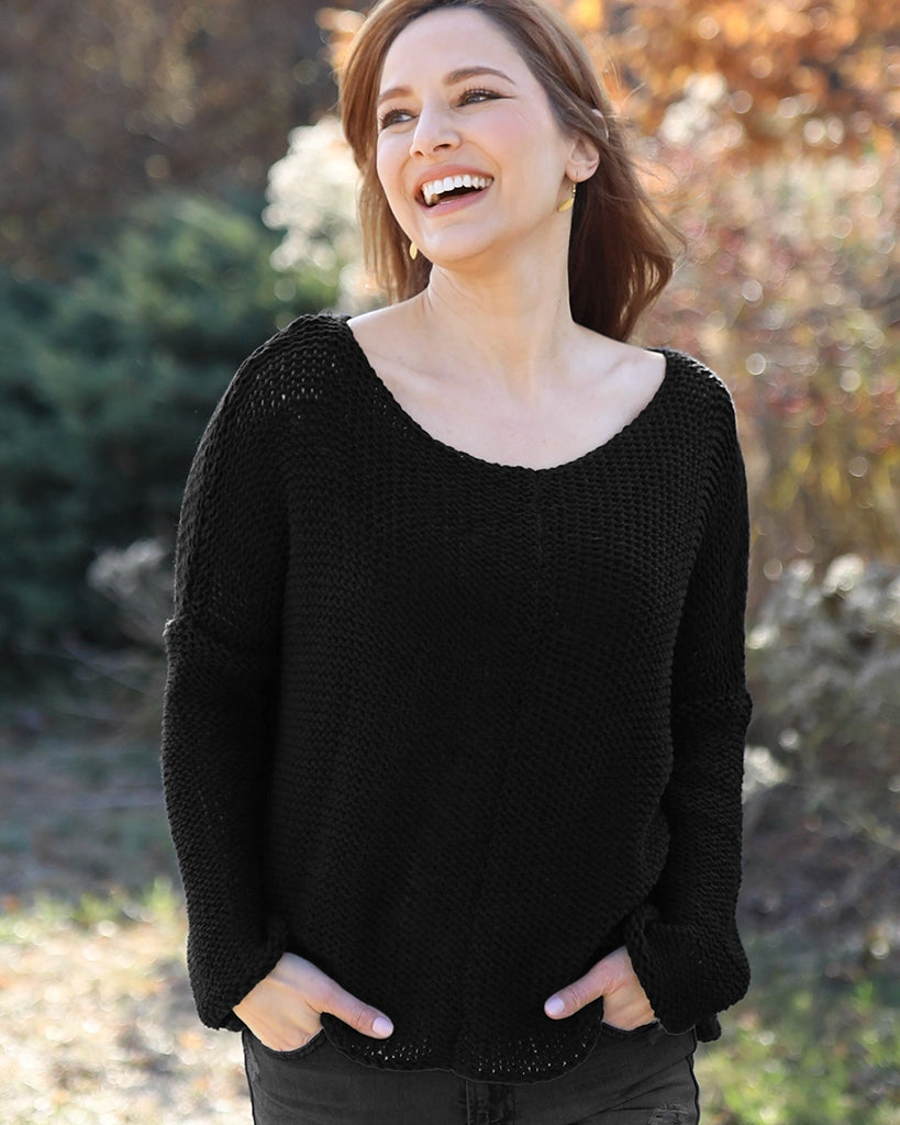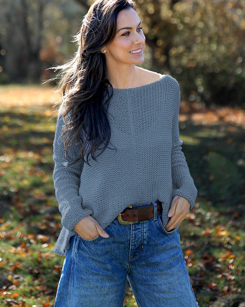 An open neckline and loose knit construction will show off a hint of what you are wearing underneath.