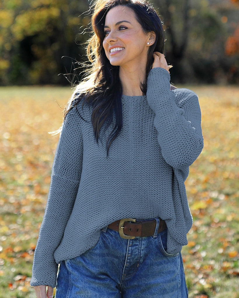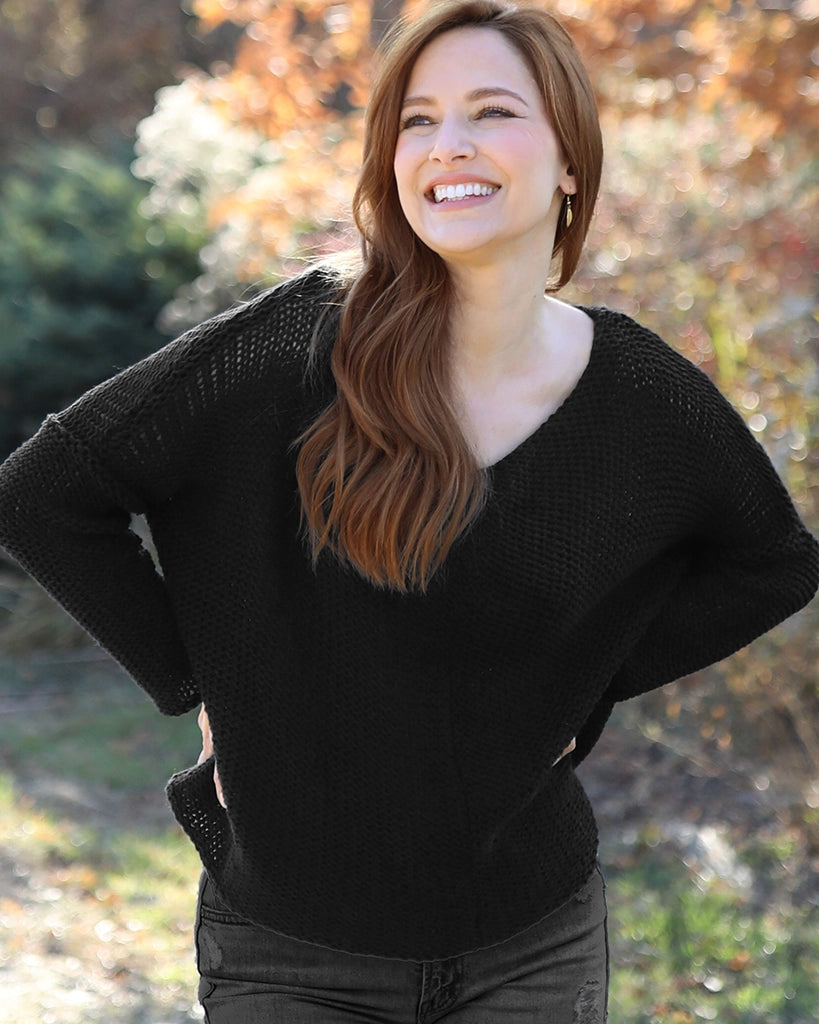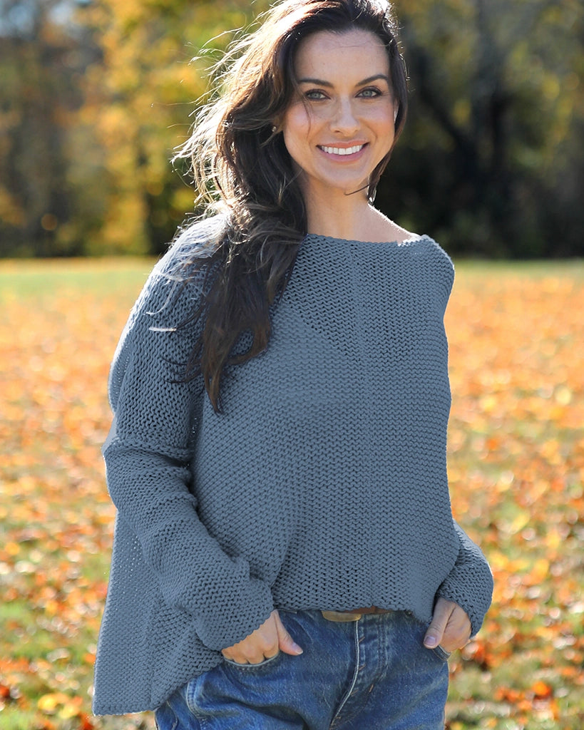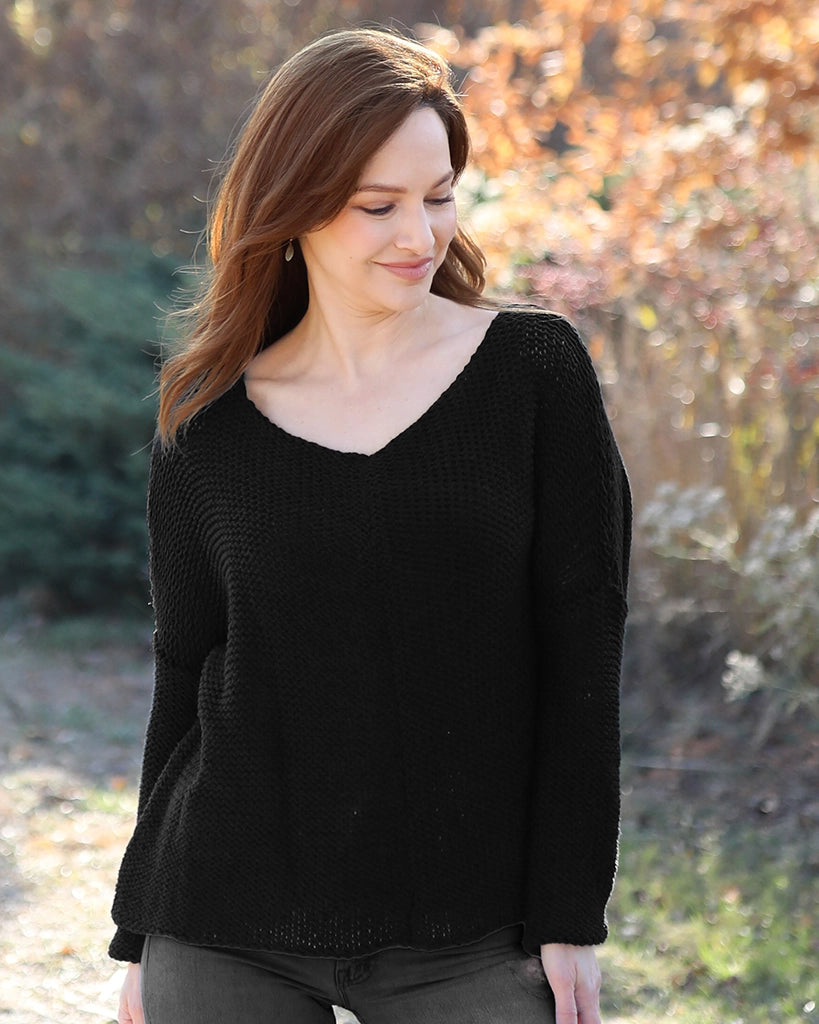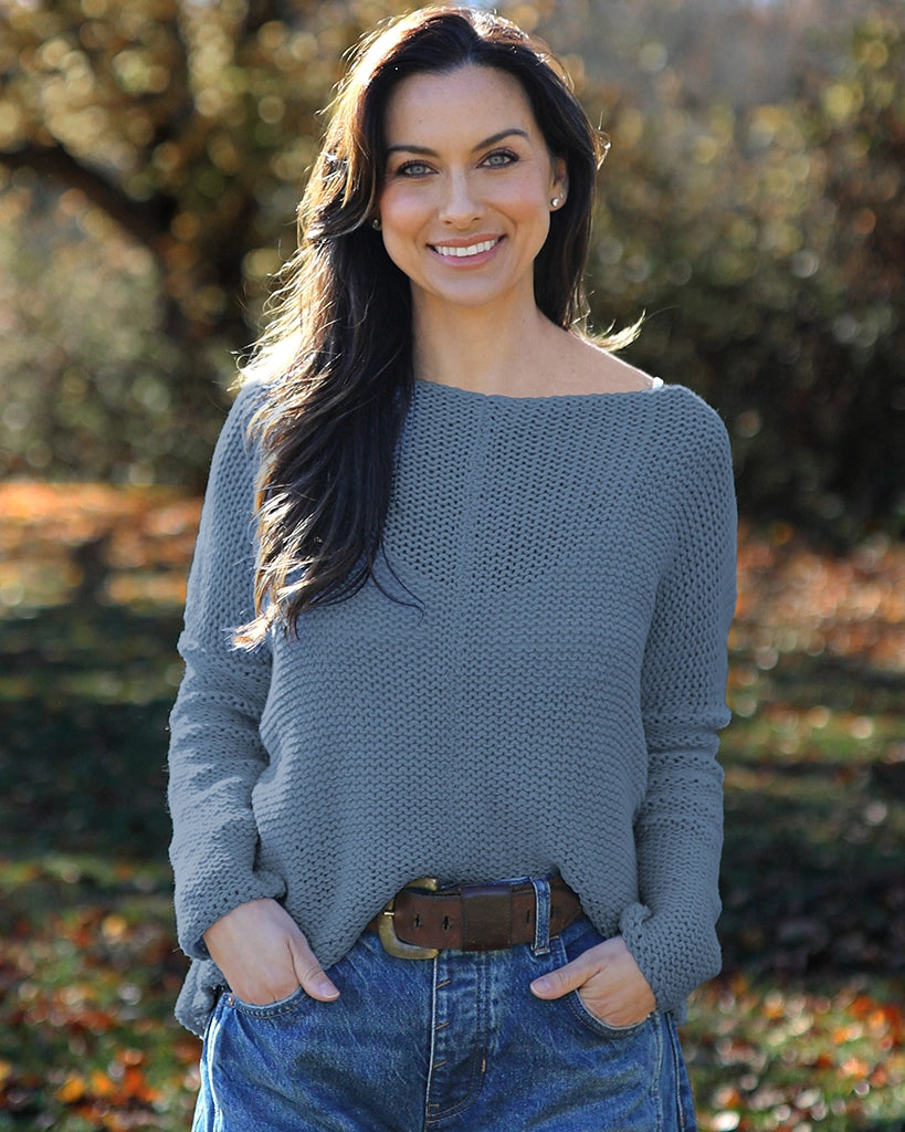 An open neckline and loose knit construction will show off a hint of what you are wearing underneath.