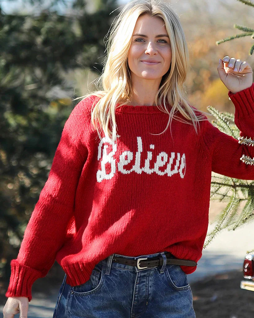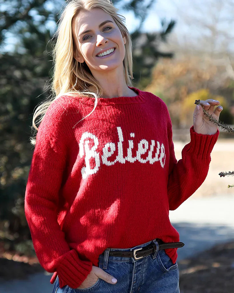 Buttery soft and super cozy, this boyfriend crew features a relaxed, flattering fit. The word "Believe" is knit directly into the center front. Ribbed details finish the neckline, hem and cuffs.