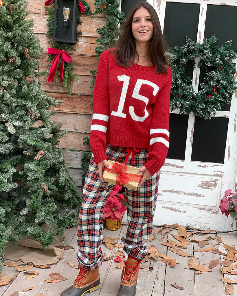 Cozy details include ribbing on the neckline, hem, and cuffs.