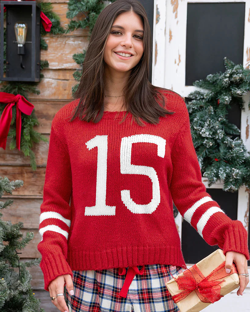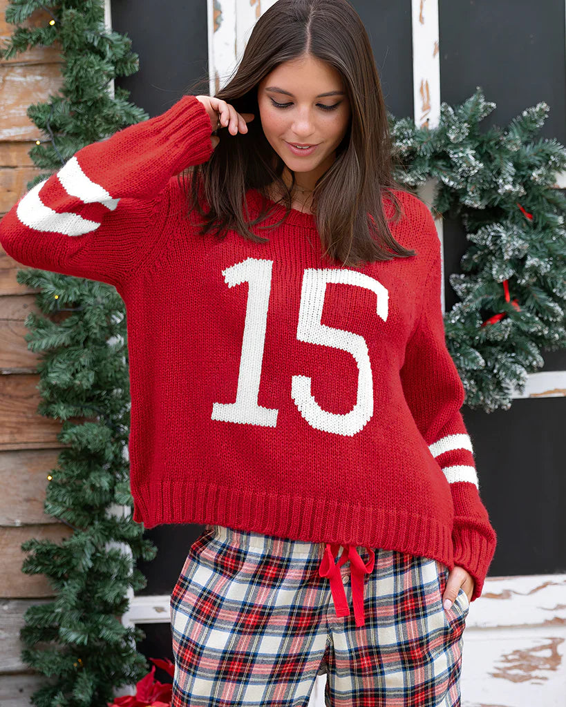 This super-soft, cozy crewneck is knit with our chunky 2-ply yarn for added warmth. Features a one or two-digit number of your choice, knit directly into the front of the sweater. Numbers cannot be knit into the back. The relaxed fit is enhanced by mini side slits, while double-band stripes on the forearms add a sporty touch.