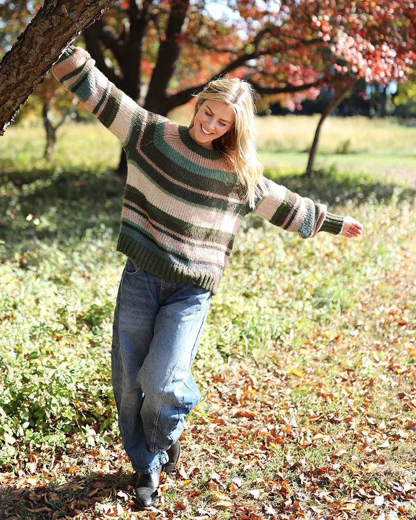 Chunky, warm, and full of fall vibes — the INEZ STRIPED RAGLAN CREW CHUNKY features bold stripes in rich autumn tones, crafted from a soft, slightly textured chunky wool blend yarn. Designed with a relaxed boyfriend fit and raglan sleeves for easy movement, it's finished with ribbed detailing at the neckline, cuffs, and hem for a clean, polished look.