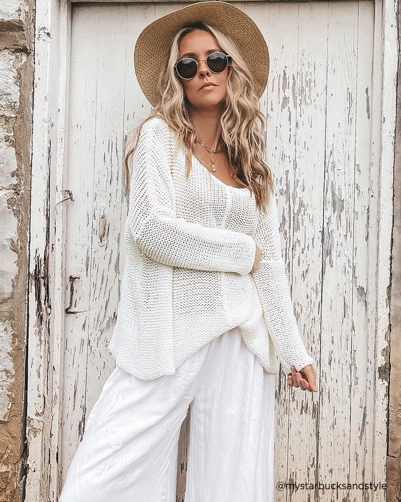 An open neckline and loose knit construction will show off a hint of what you are wearing underneath.