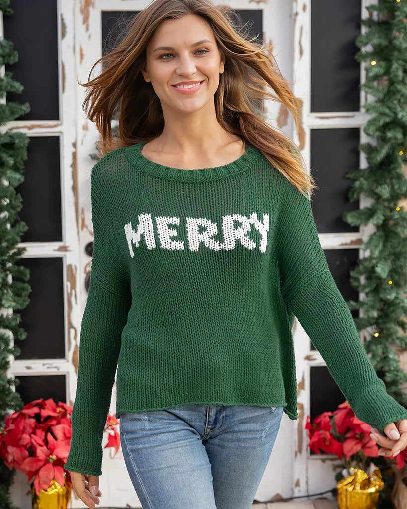 Add a cheerful touch to your holiday wardrobe with this chunky cotton sweater. Designed in a relaxed boyfriend fit with dropped shoulder sleeves for laid-back comfort. Features a bold "MERRY" graphic across the front, finished with a ribbed crew neckline and side slits.