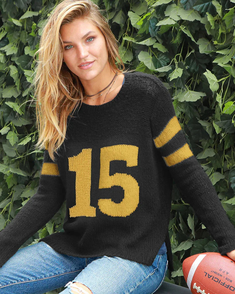 A super soft, very lightweight, and slightly slim fit crewneck with two digit number "15", knit directly into the front of the sweater. The semi-sheer nature of this knit makes it perfect for layering. The slim fit body is perfect for a demi-tuck. Sporty details include the double band stripe on the arms.