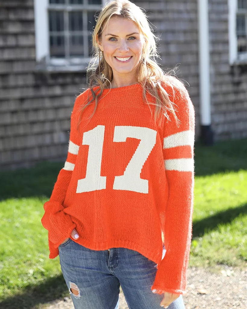 A super soft , very lightweight, and slightly slim fit crewneck with two digit number "17", knit directly into the sweater. The semi-sheer nature of this knit makes it perfect for layering. The slim fit body is perfect for a demi-tuck. Sporty details include the double band stripe on the arms.
