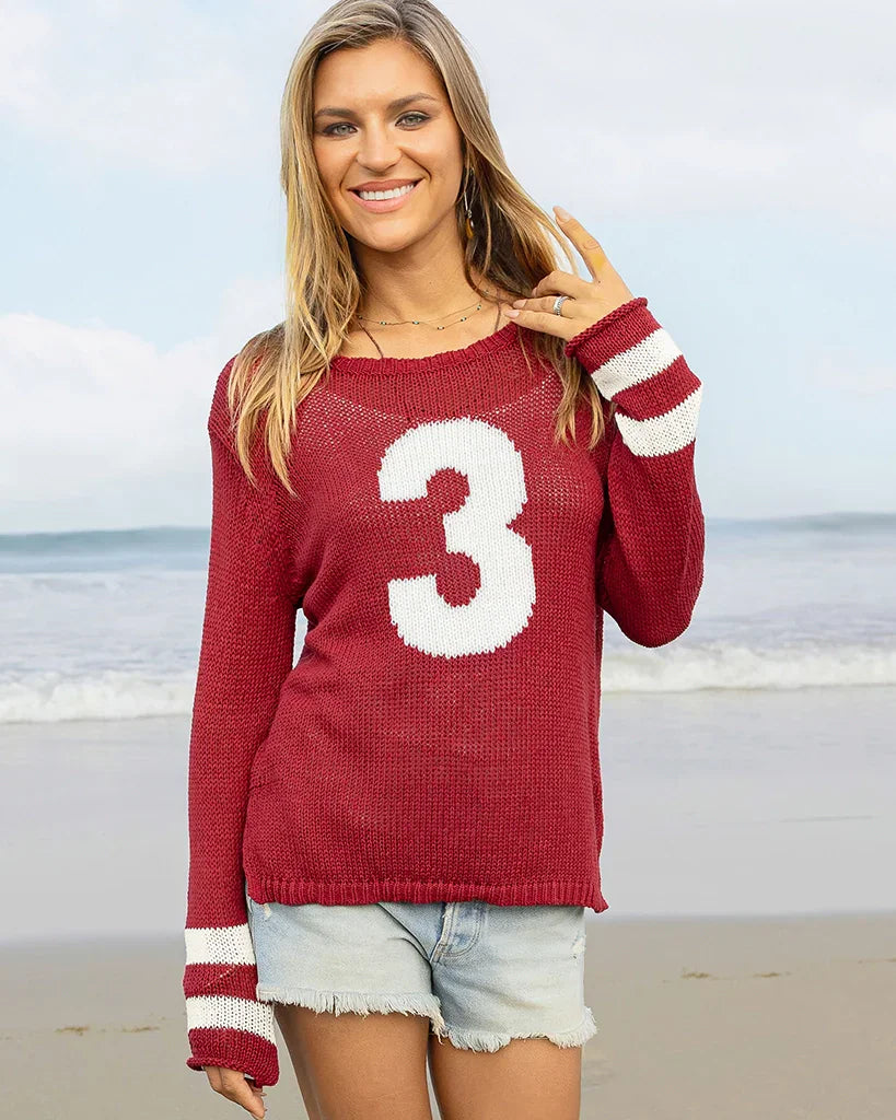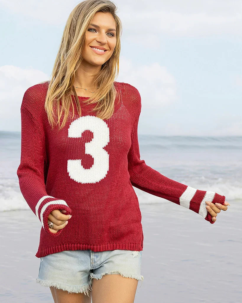 The perfect customizable top ideal for any game day! Support your favorite player with this super soft, lightweight, and slightly slim fit crewneck with one digit number "3", knit directly into the front of the sweater.