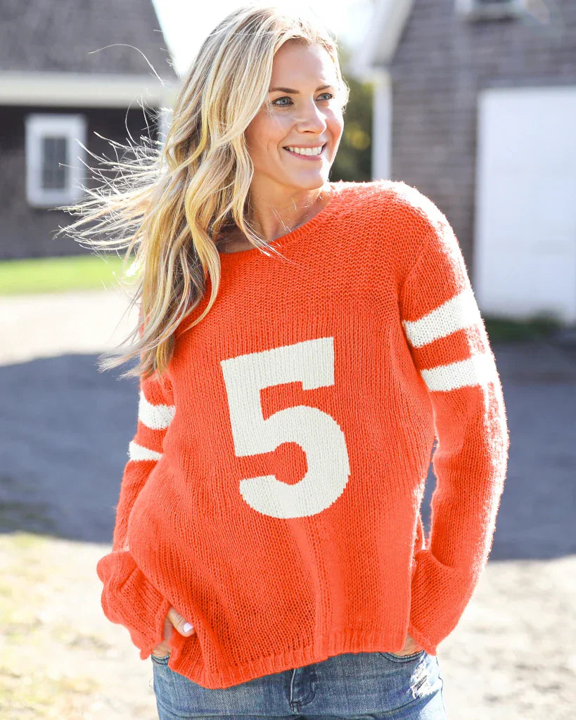 A super soft , very lightweight, and slightly slim fit crewneck with one digit number "5", knit directly into the sweater. The semi-sheer nature of this knit makes it perfect for layering. The slim fit body is perfect for a demi-tuck. Sporty details include the double band stripe on the arms.