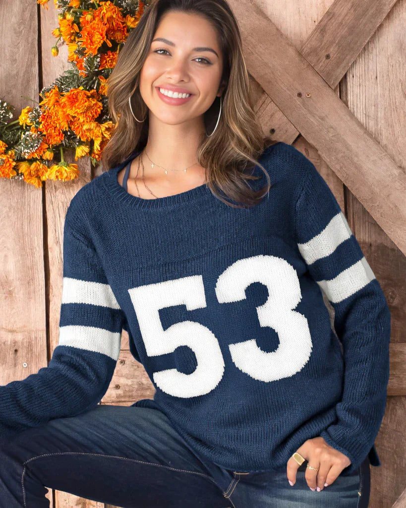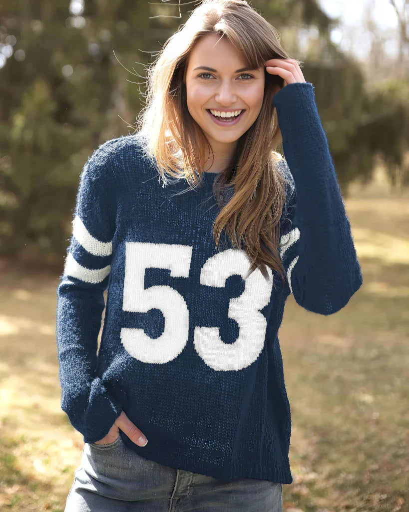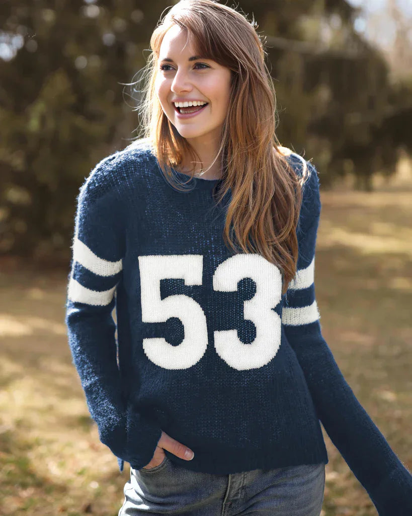 A super soft, very lightweight, and slightly slim fit crewneck with two digit number "53", knit directly into the sweater. The semi-sheer nature of this knit makes it perfect for layering. The slim fit body is perfect for a demi-tuck. Sporty details include the double band stripe on the arms.