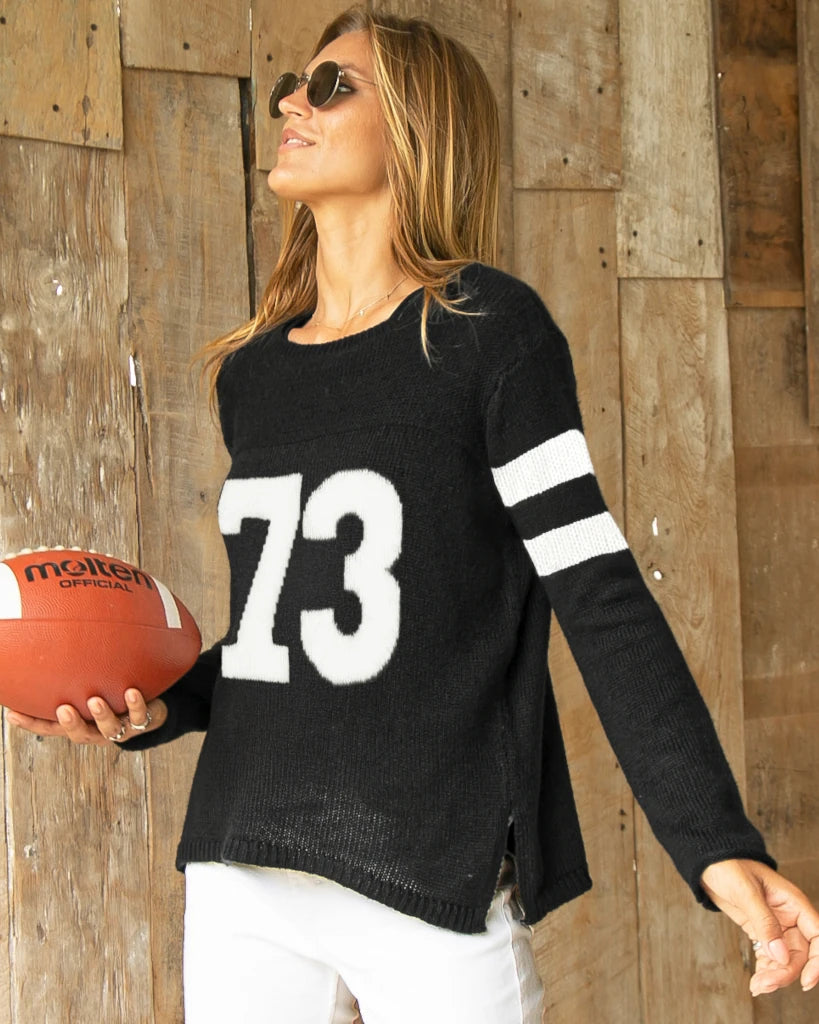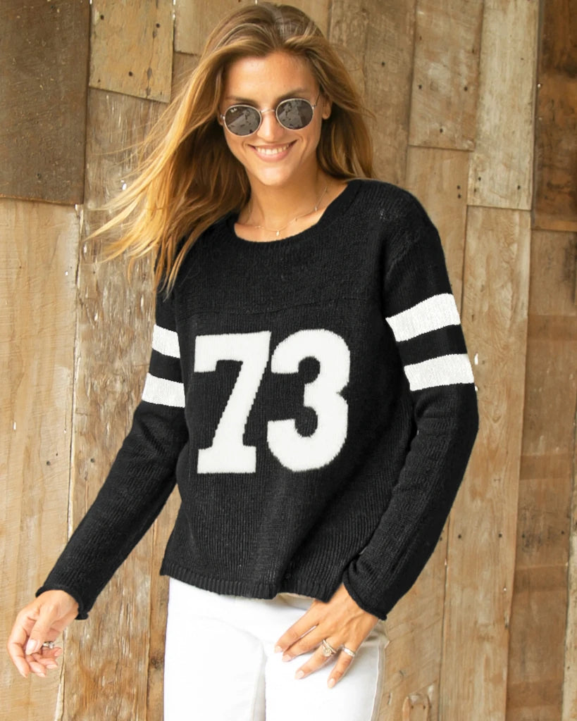 A super soft , very lightweight, and slightly slim fit crewneck with two digit number "73", knit directly into the sweater. The semi-sheer nature of this knit makes it perfect for layering. The slim fit body is perfect for a demi-tuck. Sporty details include the double band stripe on the arms.