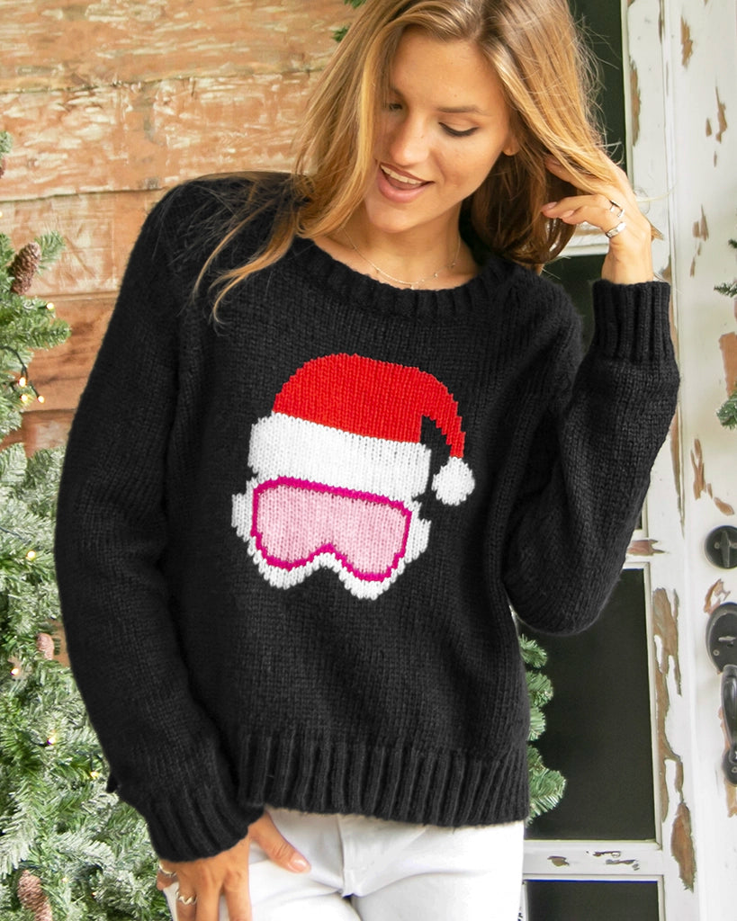 Insanely soft to the touch, this crewneck is knit in a flattering, relaxed fit that will keep you cozy all season long. The Santa hat and ski goggles graphic is knit directly onto the center front. Details include a ribbed neckline, cuffs, and hem, with mini side slits at the hem.