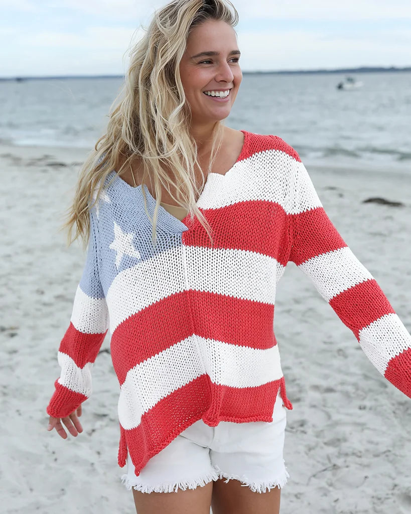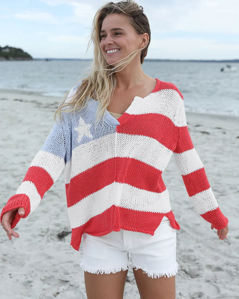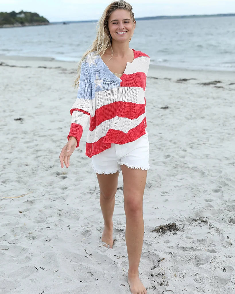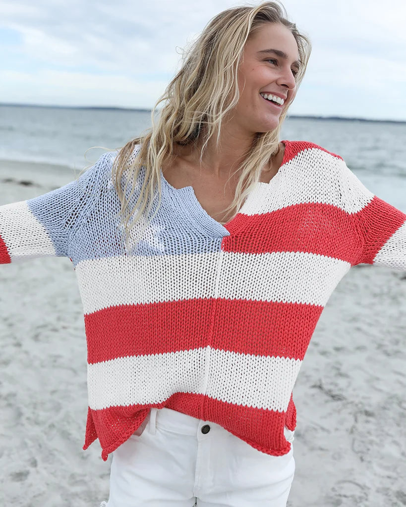 A perfectly patriotic Henley! Knit from our soft, light, and breathable cotton blend yarn, it offers comfort and style for the season. The USA flag theme makes it a perfect choice for our national holidays all summer long. This sweater features a flattering V-neck, inset sleeves, and casually rolled-up cuffs and hem for a relaxed yet stylish look.