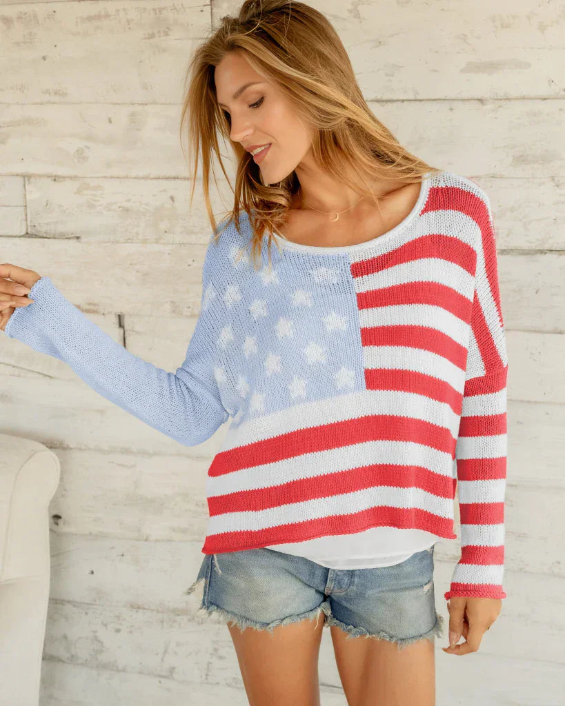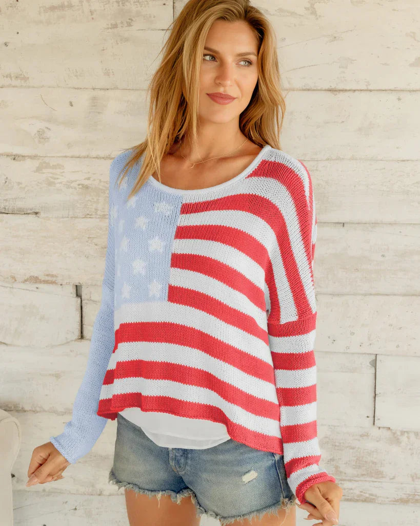 Knit using our soft, light, and breathable cotton blend yarn, this all-American top is designed for comfort and style all season long. The USA flag theme makes it an ideal choice for celebrating patriotic holidays. This super cropped sweater features a classic crewneck, rolled edge finish at neck and cuffs, and relaxed drop sleeves, creating an effortlessly stylish and laid-back look.