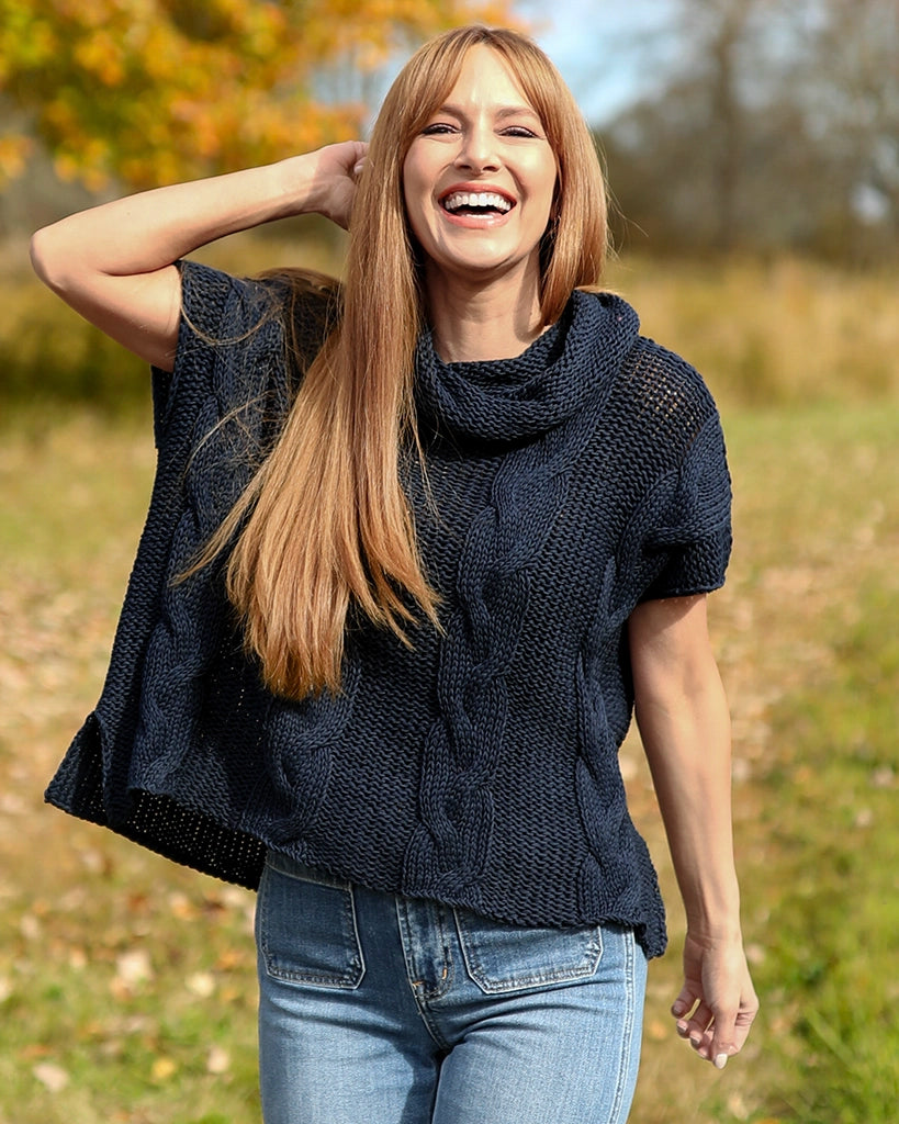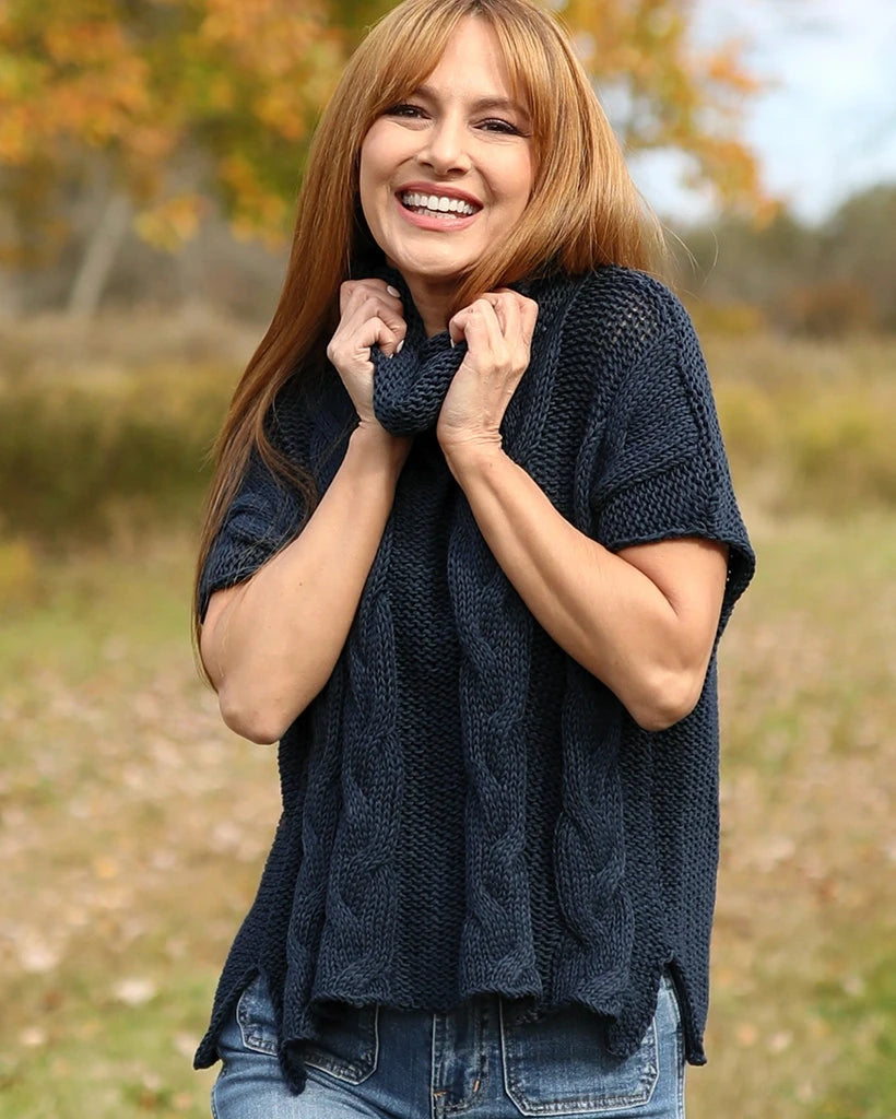 A modern take on a classic cable knit. This sleeveless sweater features a cozy cowl neckline, flattering slightly cropped fit, and subtle side slits for added ease and movement.