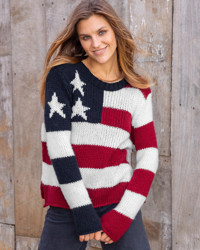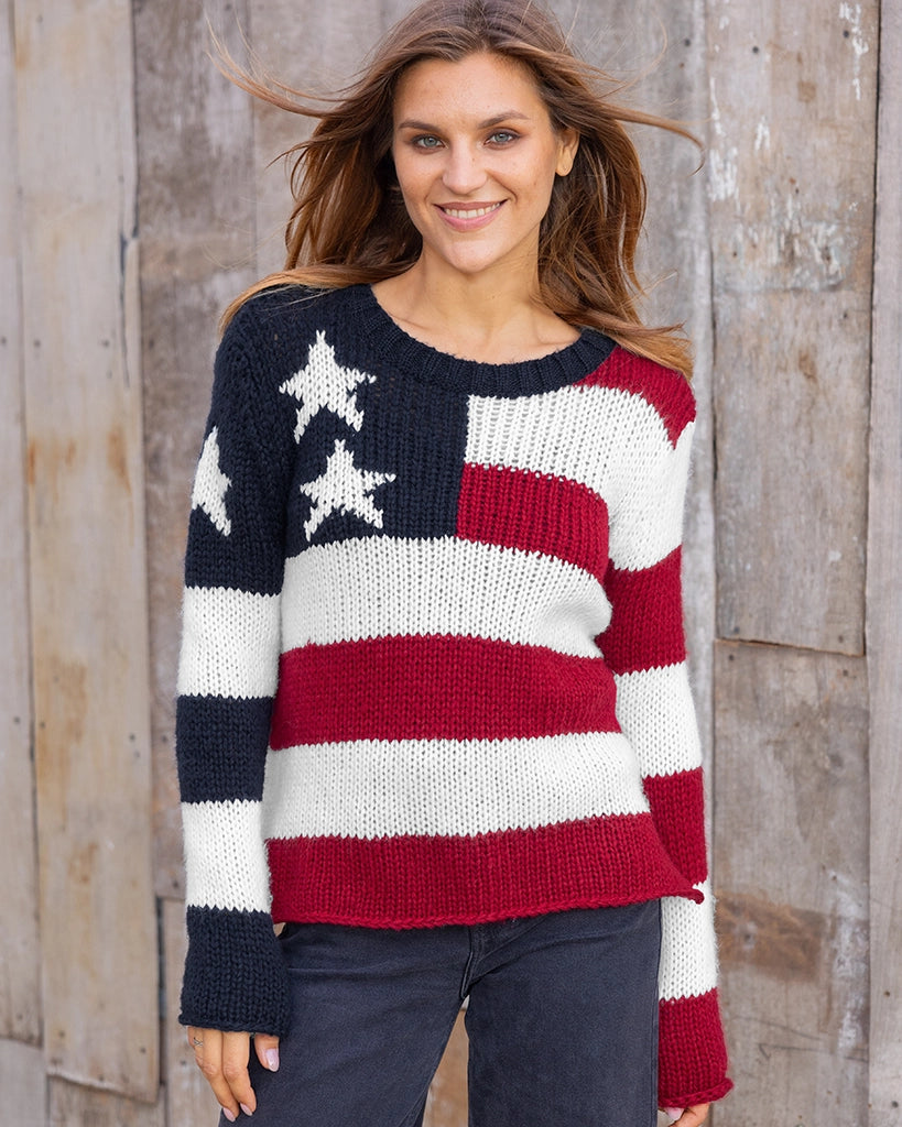 This all-American top is knitted from our super-soft, chunky yarn. Featuring a bold USA flag motif, it’s the perfect statement piece for patriotic holidays and beyond. Designed with a relaxed, slouchy fit, ribbed neckline, and side slits, it delivers easy comfort with standout style.