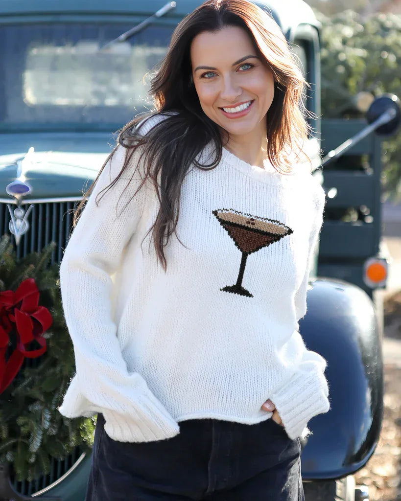 Cozy and fun, this cropped sweater features an espresso martini graphic knit directly into the center front. Designed with inset sleeves for a clean look, it’s finished with ribbed detailing at the neckline and cuffs, and a roll-edge hem for a relaxed touch.