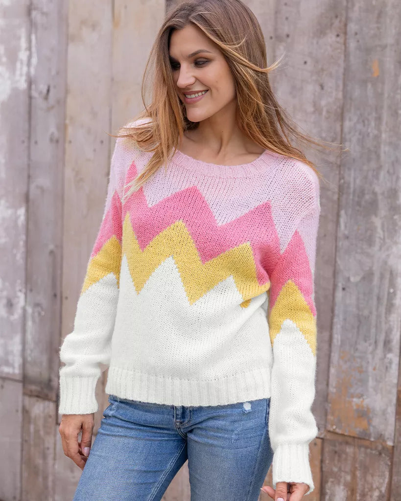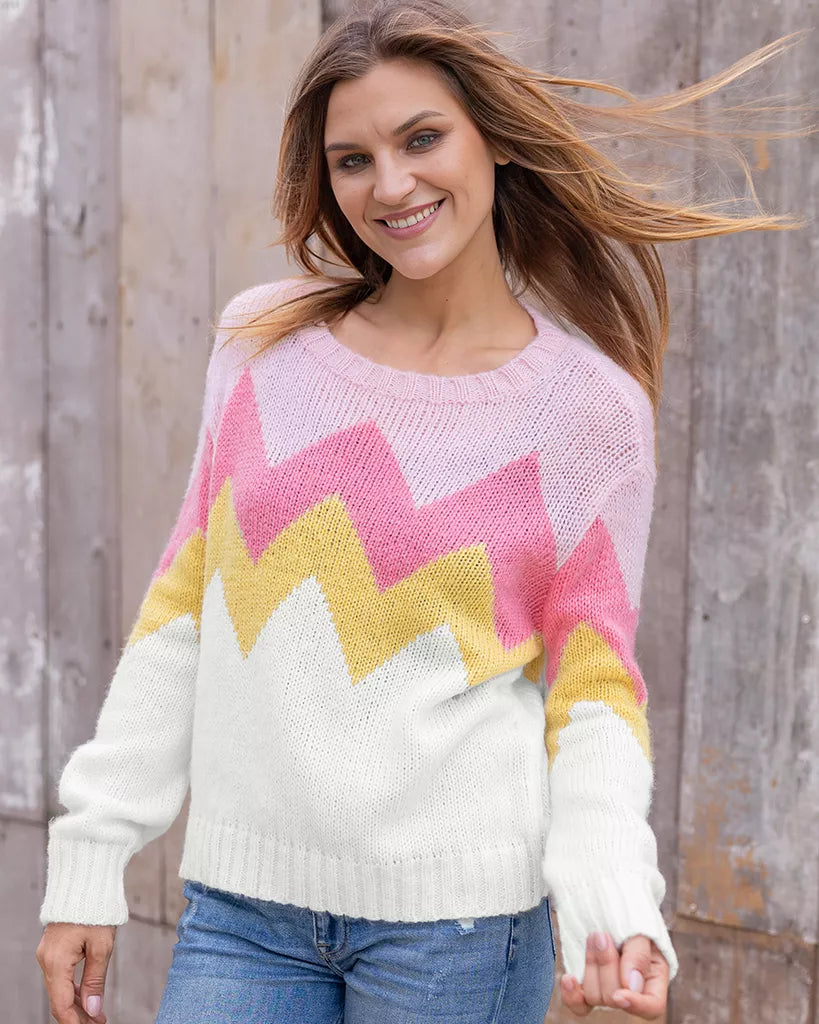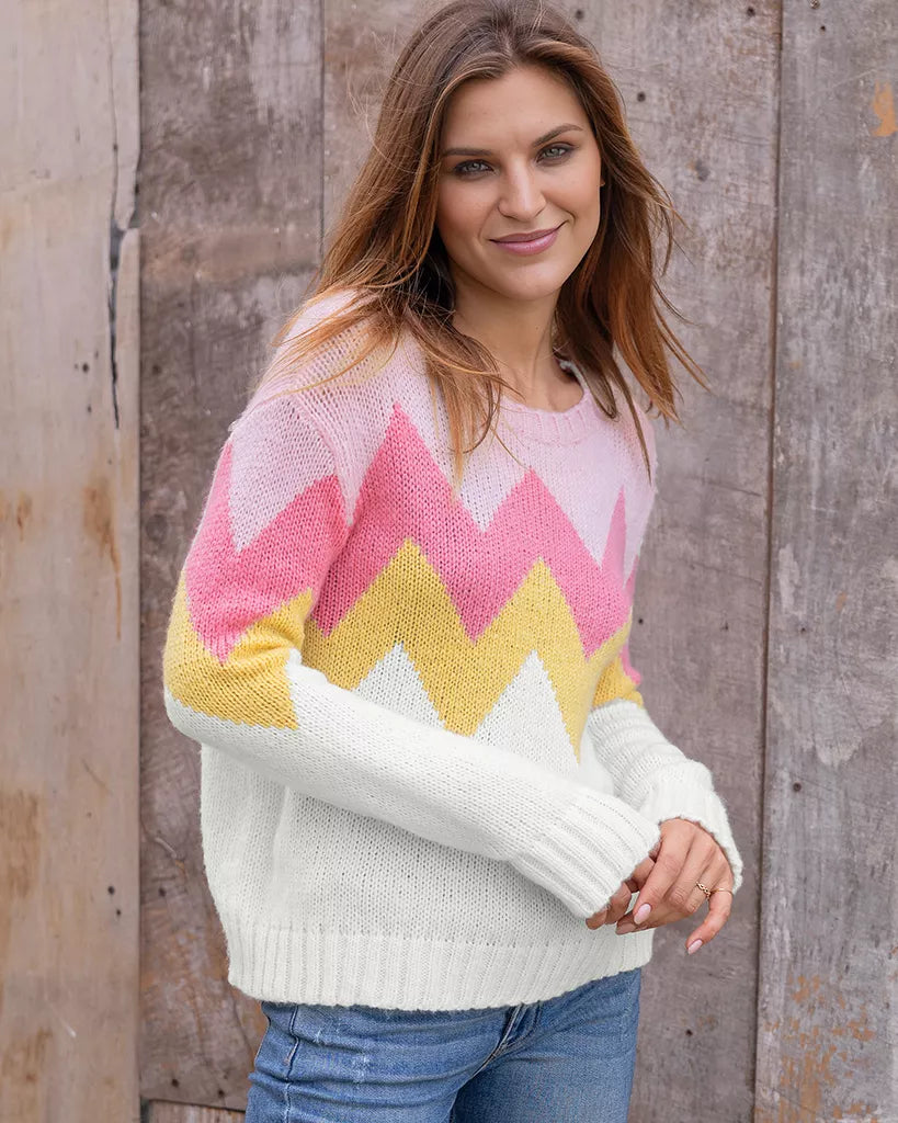 Stay warm and stylish with this cozy crewneck crafted from our luxurious wool blend. The bold zigzag graphic adds a playful yet contemporary touch, making it a standout piece for any casual day. Designed with inset sleeves and ribbed finishes for a comfortable, polished look.