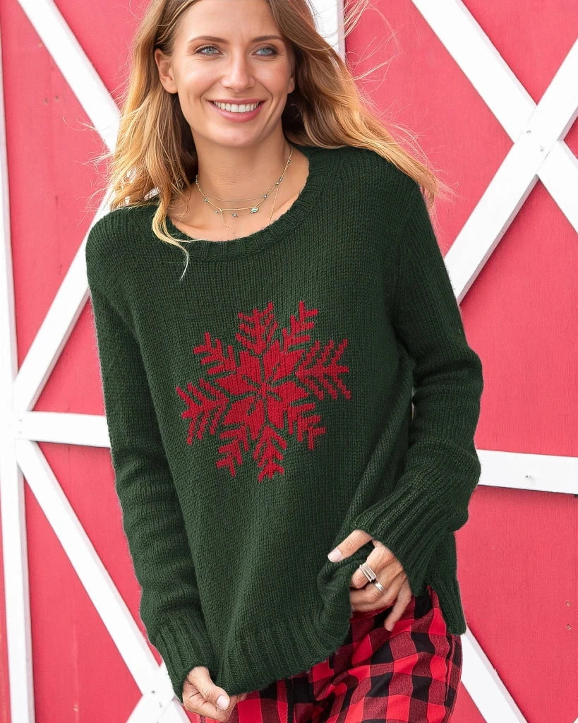 Oh-so-soft and cozy, this crew features a geometric snowflake knit directly into the center front. The fit is relaxed and the inset sleeves makes this the perfect knit to layer comfortably under any coat. Cozy rib finishing on the neckline, cuffs and hem.