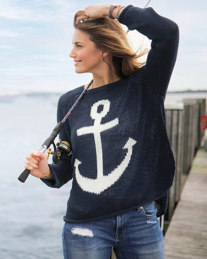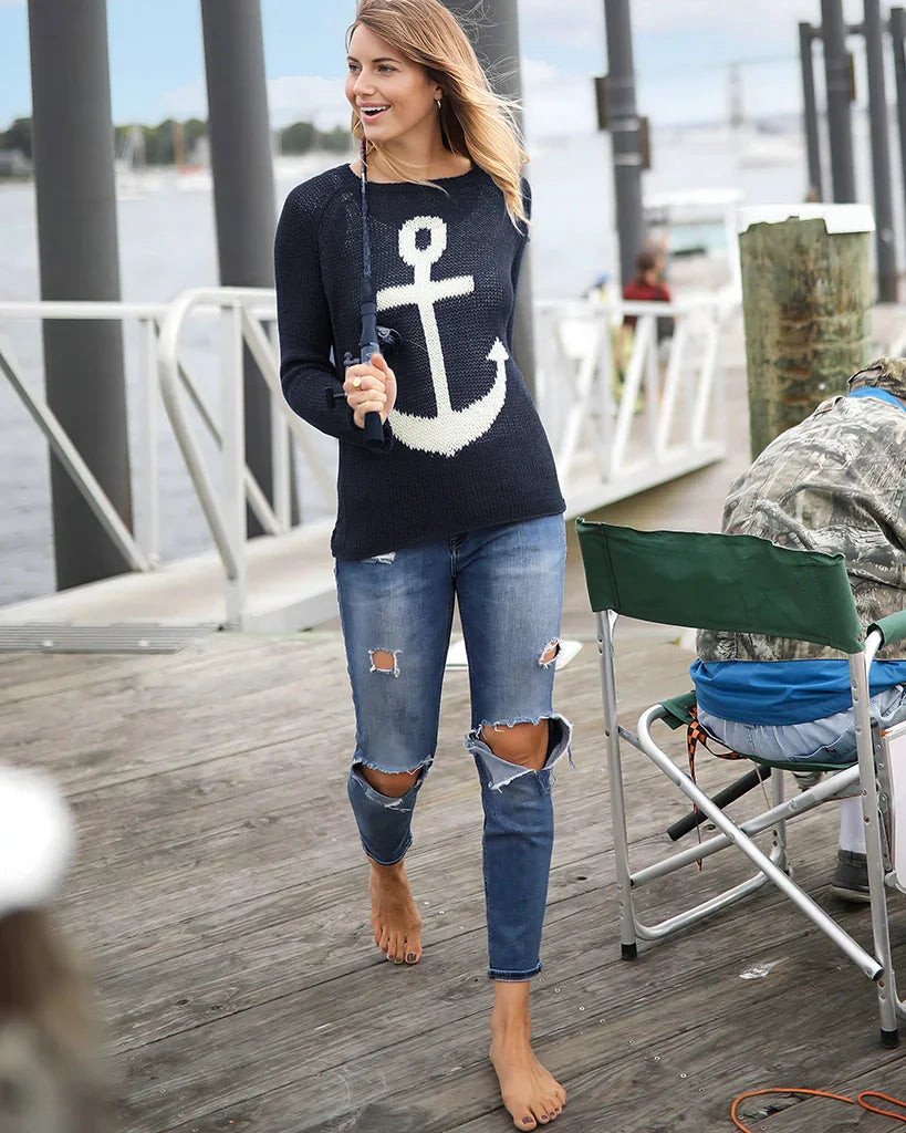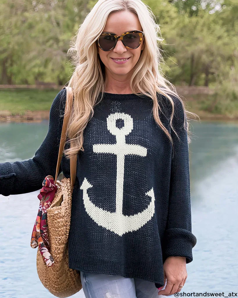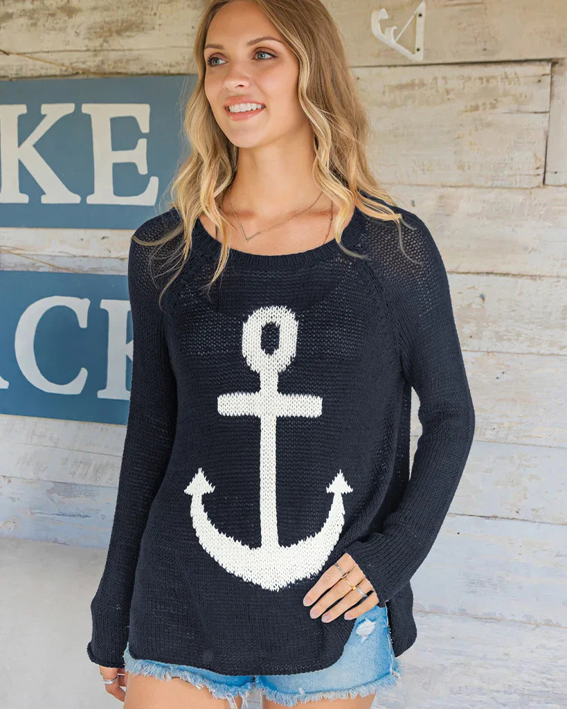 Knit in our airy, ropey and soft cotton blend yarn. This nautical top features an anchor graphic knit directly into the center front. Flattering, curved shirt-tail hems with side slits. Raglan sleeves and a relaxed fit creates the perfect casual vibe.