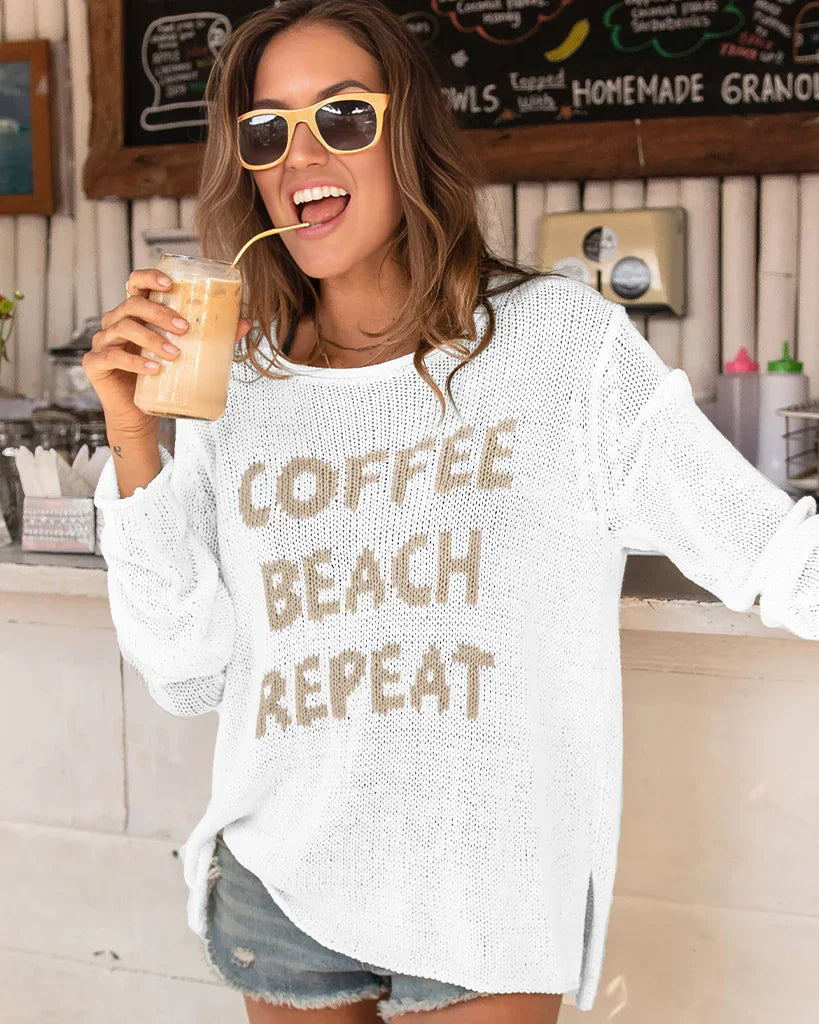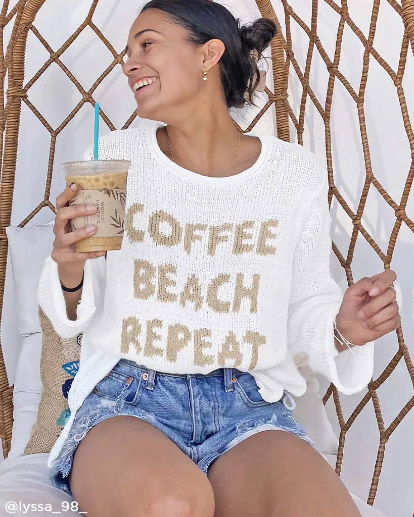 Your two favorite things in one sweater. This cotton blend top is lightweight, airy and breathable. Super soft for all day comfort. The words "coffee beach repeat" are knit directly into the center front. The fit is relaxed.