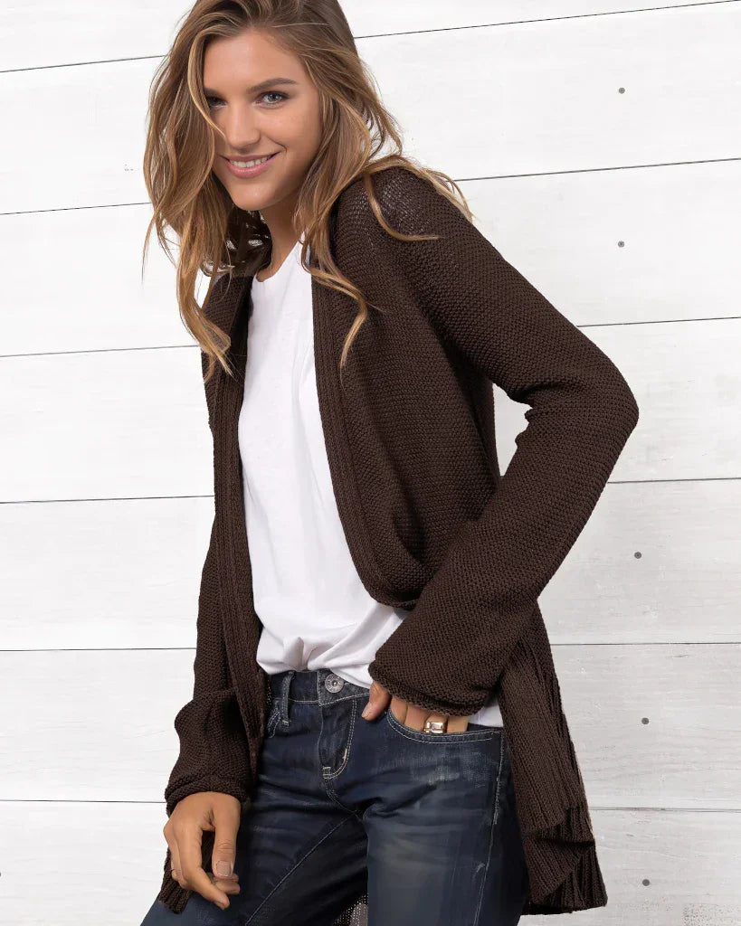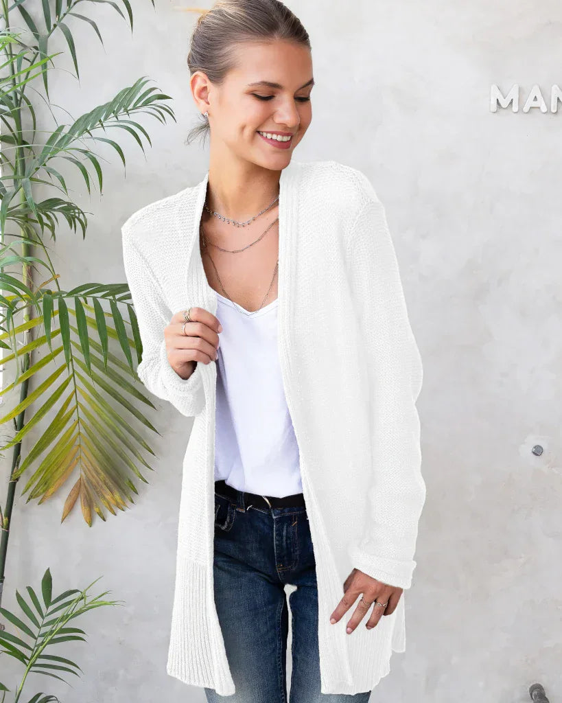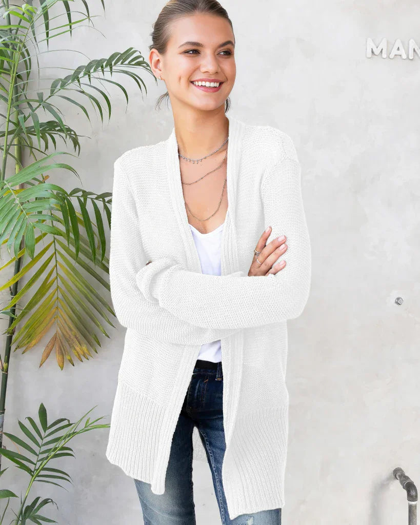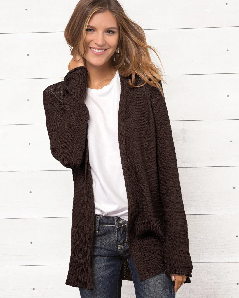 Knit from our soft, ropey and breathable cotton blend yarn, this versatile cardigan is a must-have. The beauty of this comfy cardi sweater is created by the long ribbing details on the hem and cuffs, creating a slimming effect. The longer length creates a unique look and is perfect for layering.