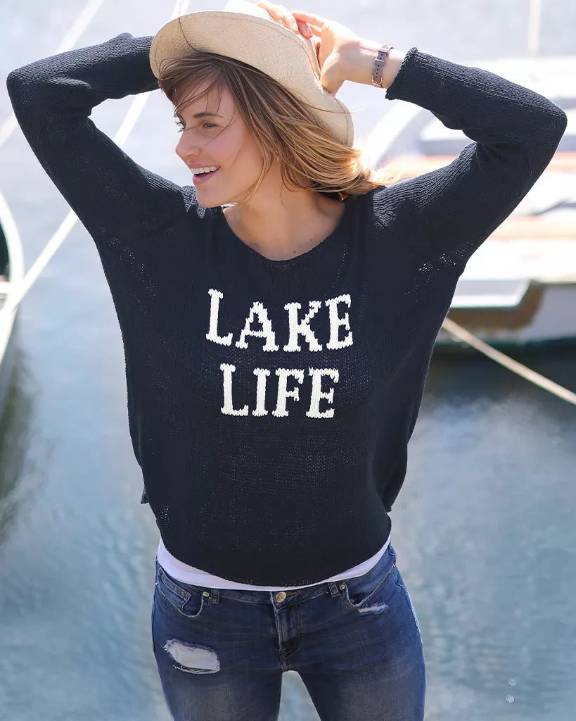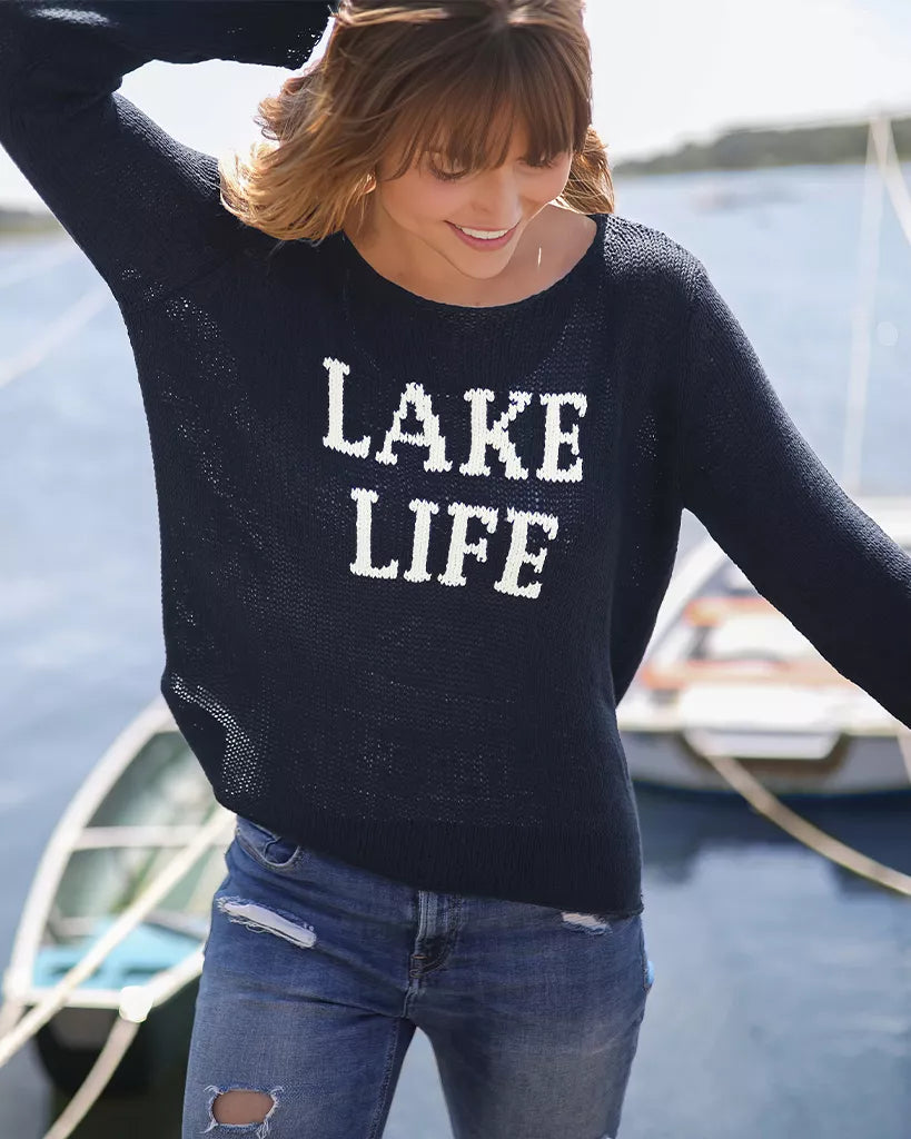 Your search for the perfect lake outfit is over. Knit from our soft, lightweight, and breathable cotton blend yarn, this top has an easy, flattering fit. "Lake life" is knit directly into the center front. The open crewneck perfectly frames your clavicles and adds a feminine touch to this boyfriend inspired fit.