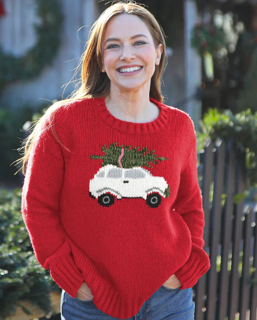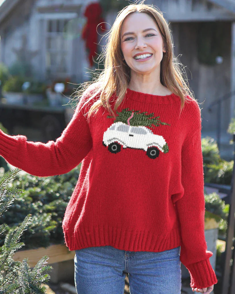 Cozy up in this adorable, fresh take on a Christmas sweater. Super soft and knit in a flattering, relaxed boyfriend fit. The holiday themed graphic is knit directly into the sweater. Details include ribbed finishes and mini side slits at the hem.