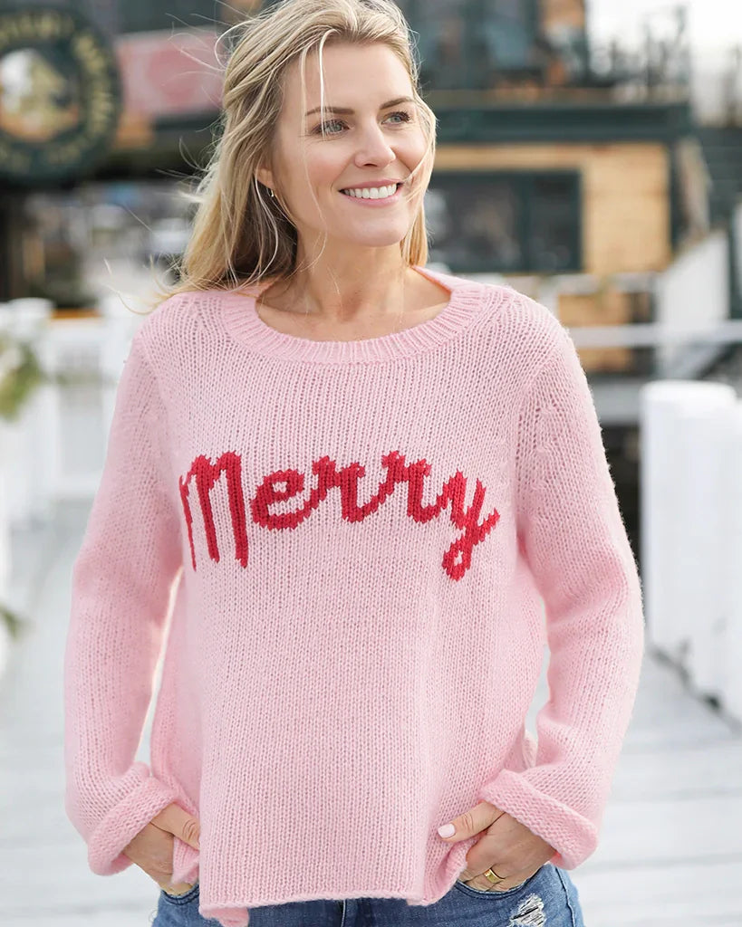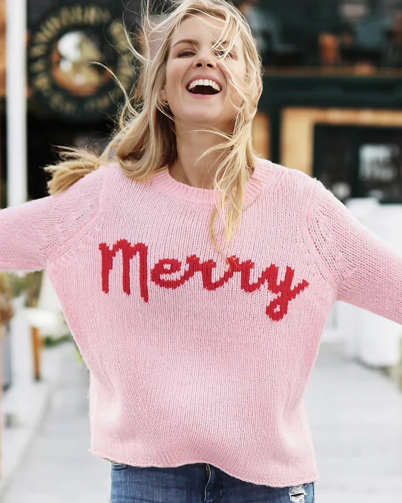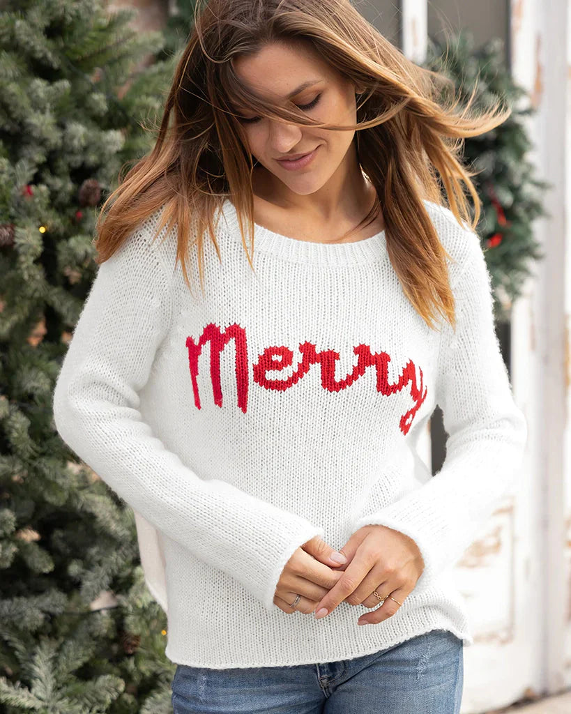 A Christmas top seller! Soft, light and cozy wool blend sweater featuring the word "Merry" knit directly into the center front. The flattering, boyfriend fit has the perfect amount of slouch, making this a great top for layering in cooler weather. Details include ribbing on the neckline, single stitch finish at the hem and rolled cuffs.