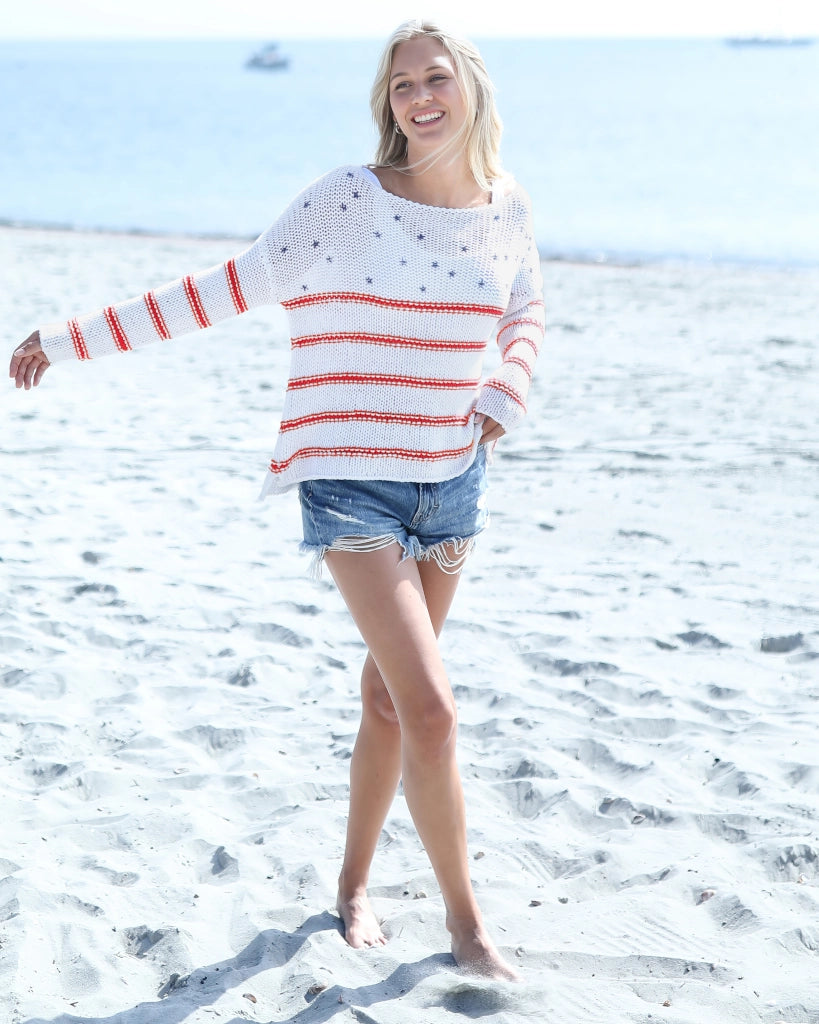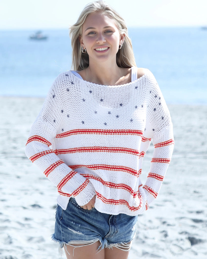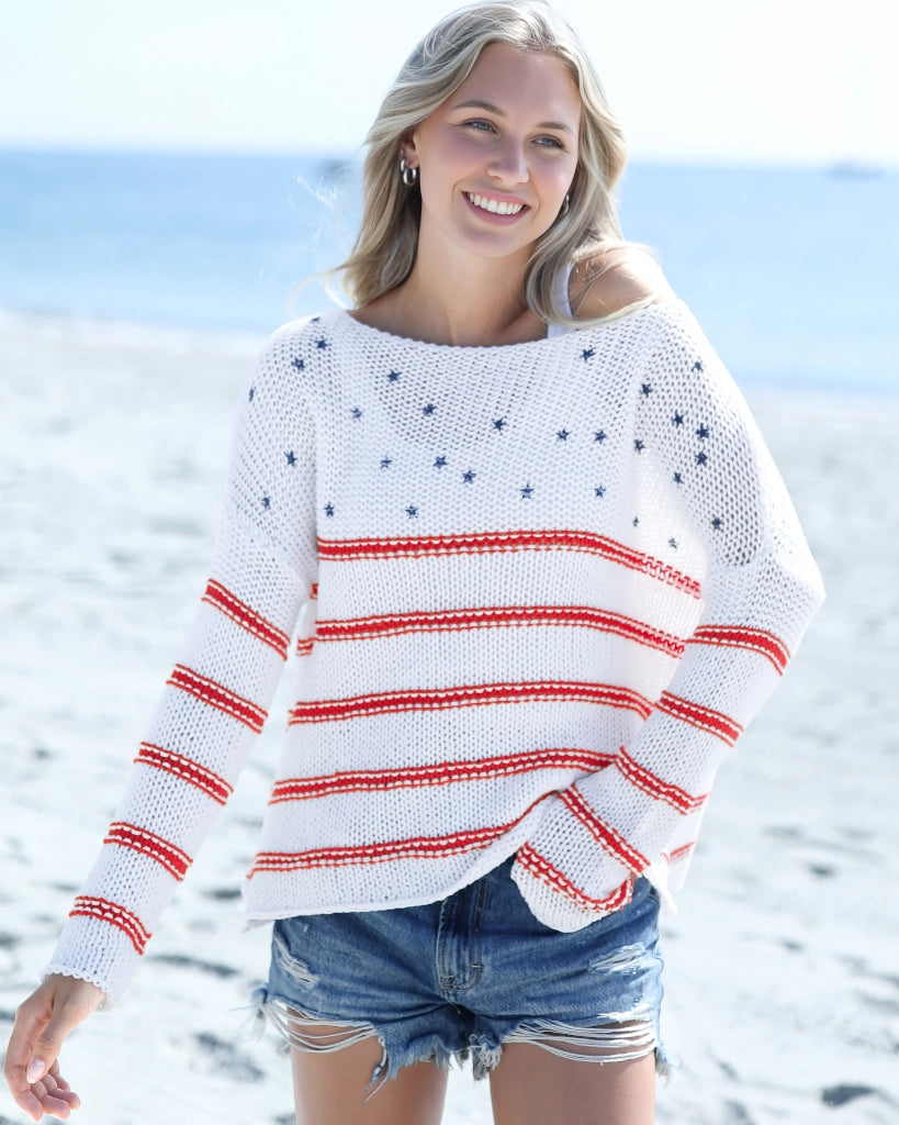 A relaxed fit, designed for breathable comfort with an ultra-soft, buttery handfeel - this is your AMERICAN DREAM CREW COTTON. A feminine crewneck and dropped shoulders create an easy drape through the body, while long sleeves and mini side slits at the hem add natural movement for layering on spring days. Finished with contrast stripes and a small printed stars motif at the center front, it delivers a clean Americana feel that’s subtle, polished, and effortless.