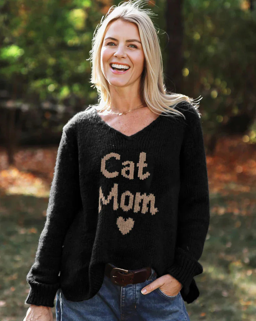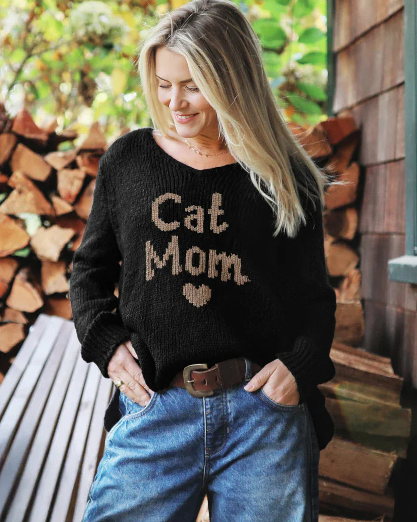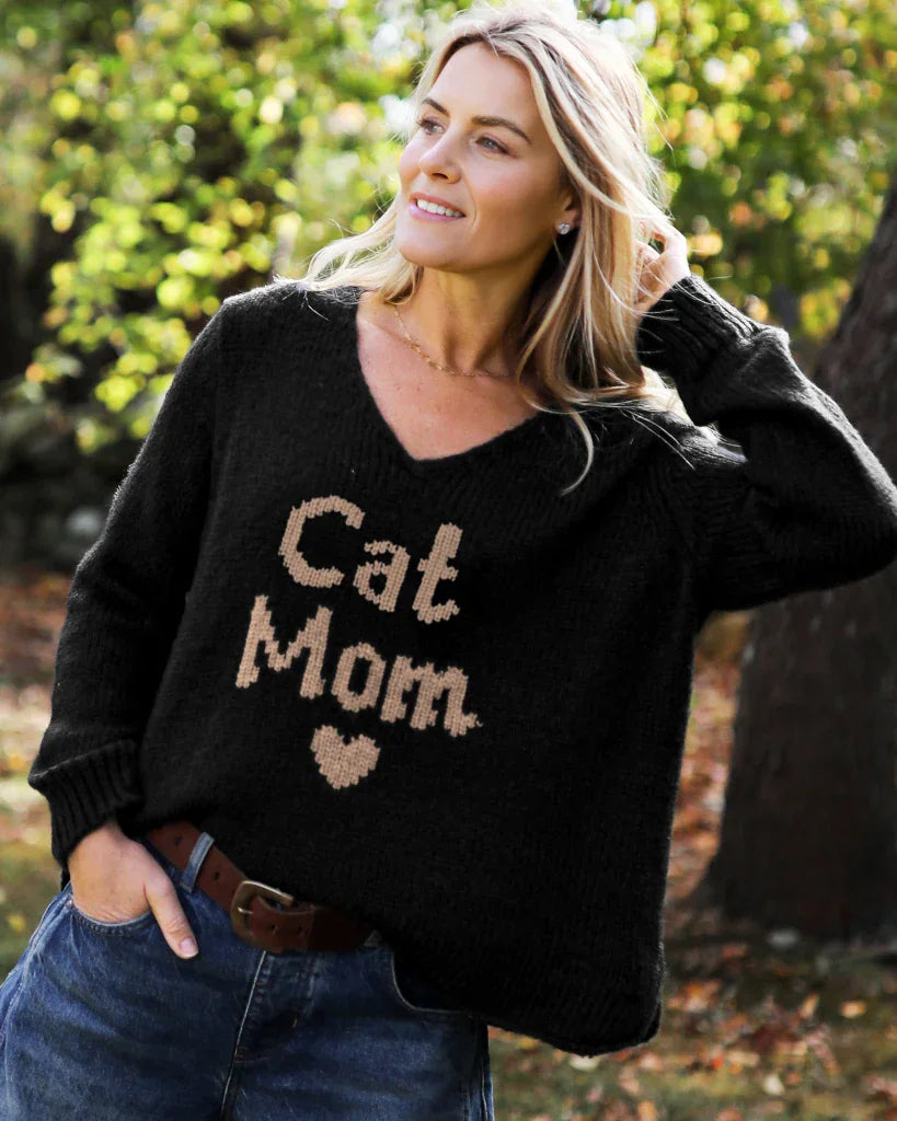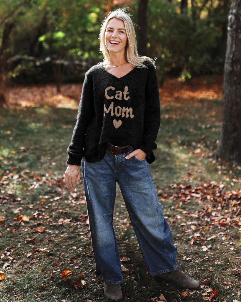 Made from a soft and cozy knit blend, this sweater features the words “Cat Mom” with a mini heart at the center front. Designed with a flattering V-neckline, shirt-tail hem with a single-stitch finish, and side slits for easy movement, it’s a perfect everyday piece for comfort and style.