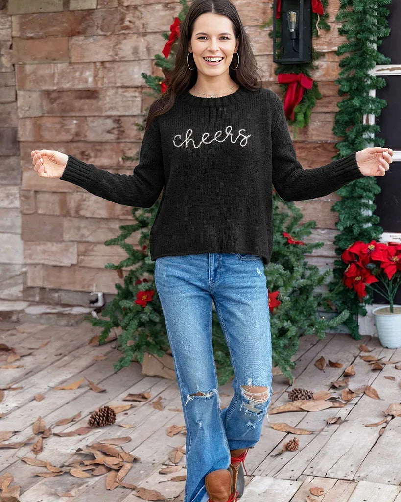 Buttery soft and lightweight, this sweater offers effortless comfort with a cozy feel. The word “cheers” is delicately embroidered across the center front, adding a festive touch. Finished with ribbing at the crew neckline and cuffs, along with subtle side slits for easy movement.