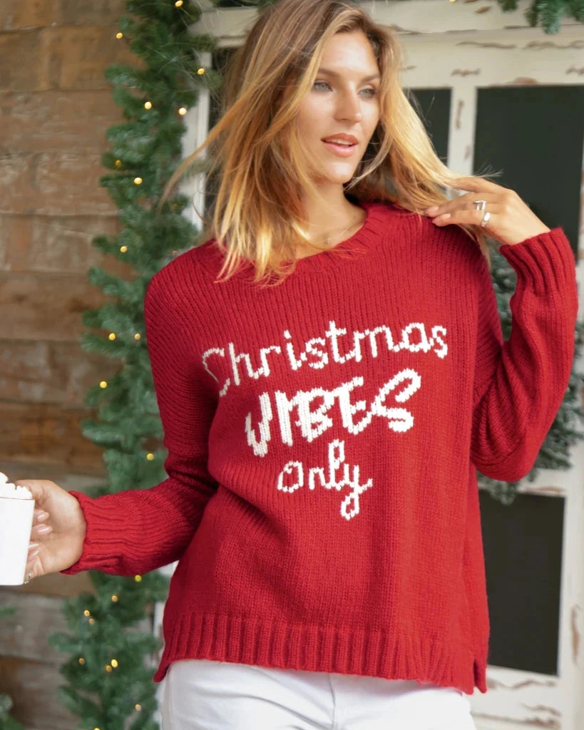 The ultimate boyfriend sweater! Insanely soft with a boxy fit and dropped shoulders, it creates a just-loose-enough silhouette that’s both flattering and cozy. The phrase "Christmas VIBES Only" is knit directly into the sweater, making it a perfect choice for your holiday wardrobe. Chunky ribbed cuffs hug your wrists, keeping the sleeves in place, while the hem features additional ribbed details and a side slit to prevent clinging. We love how it pairs with everything, from a casual wide-leg look to sexy slim jeans—you really can’t go wrong.