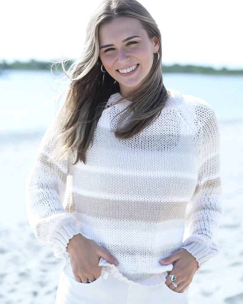 Meet your new favorite for in-between days—when mornings are crisp, afternoons are bright, and you want something cozy that still feels light and spring-ready. The INEZ STRIPED RAGLAN CHUNKY CREW is knit from our signature cotton-blend yarn in a chunky, textured stitch and finished with playful, multi-color stripes for an easy pop of personality.