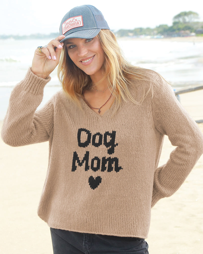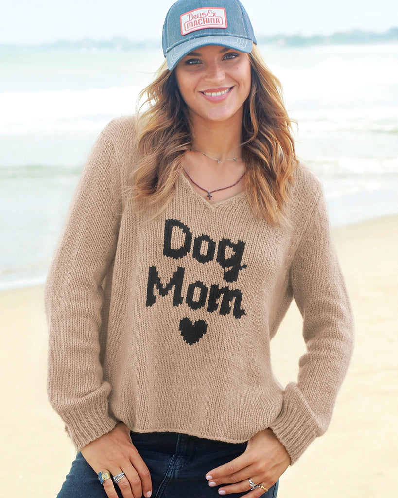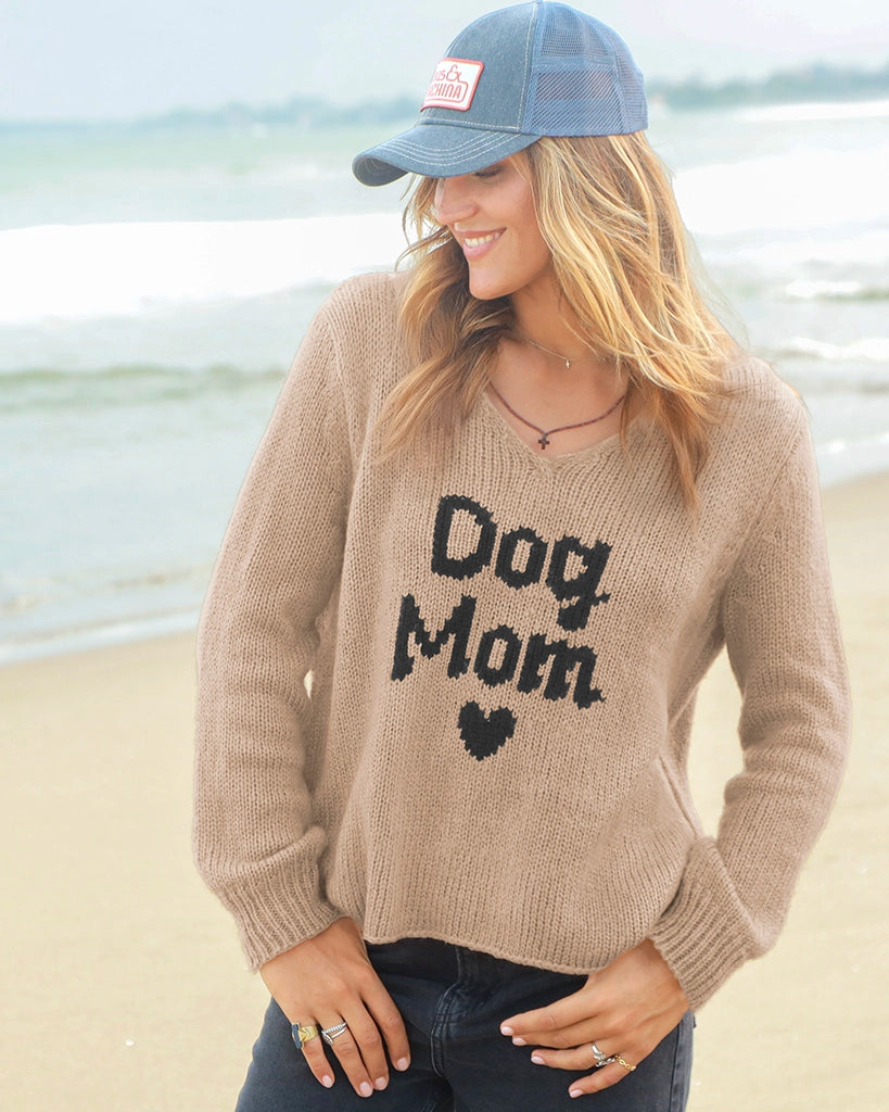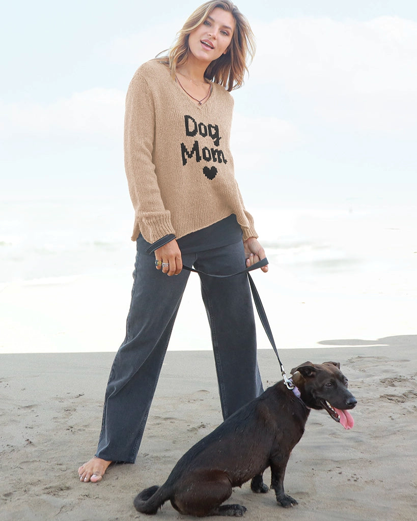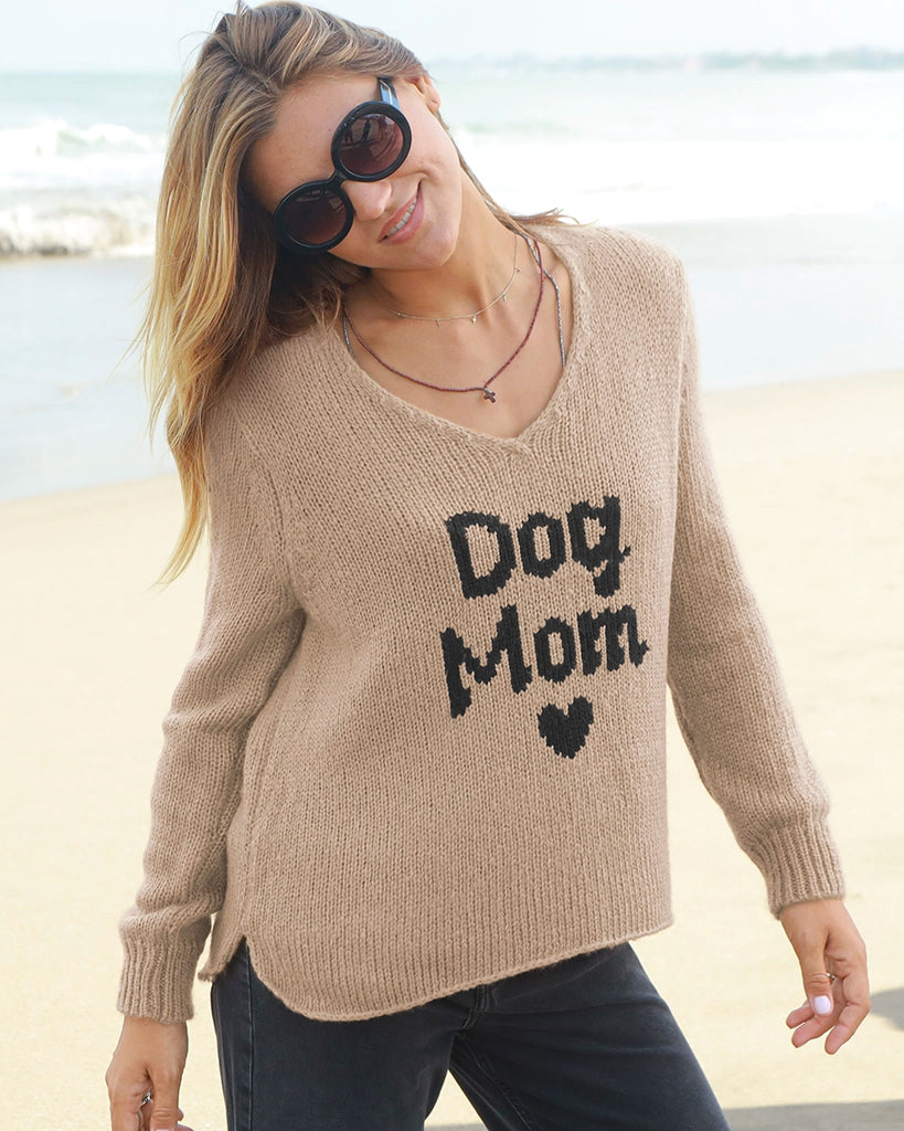 Made from a soft and cozy knit blend, this sweater features the words “Dog Mom” with a mini heart at the center front. Designed with a flattering V-neckline, shirt-tail hem with a single-stitch finish, and side slits for easy movement, it’s a perfect everyday piece for comfort and style.