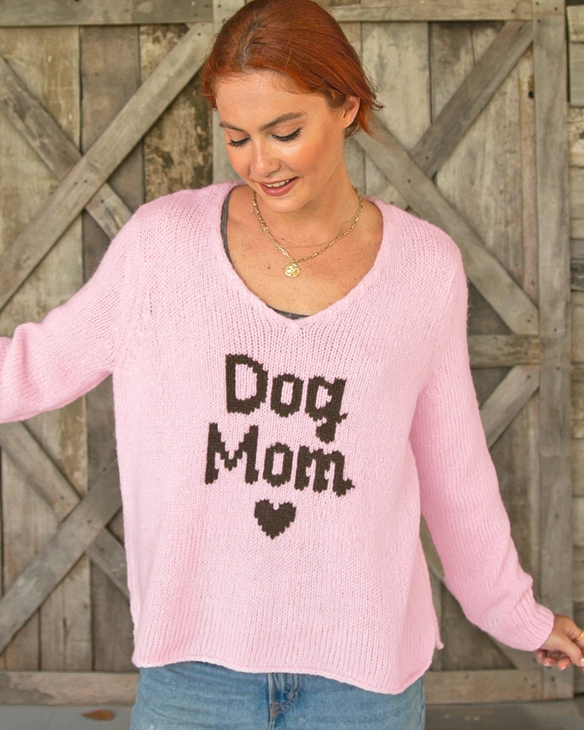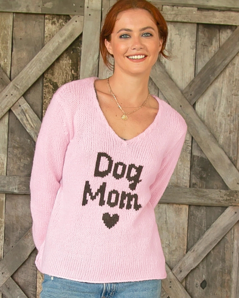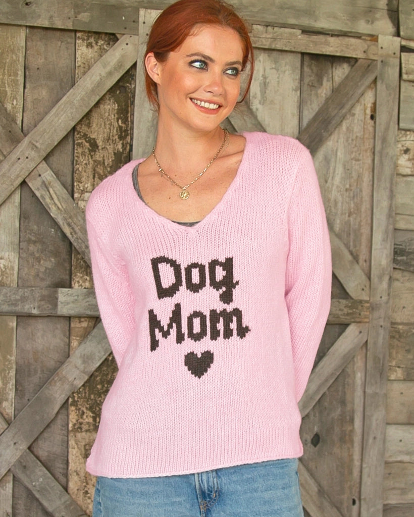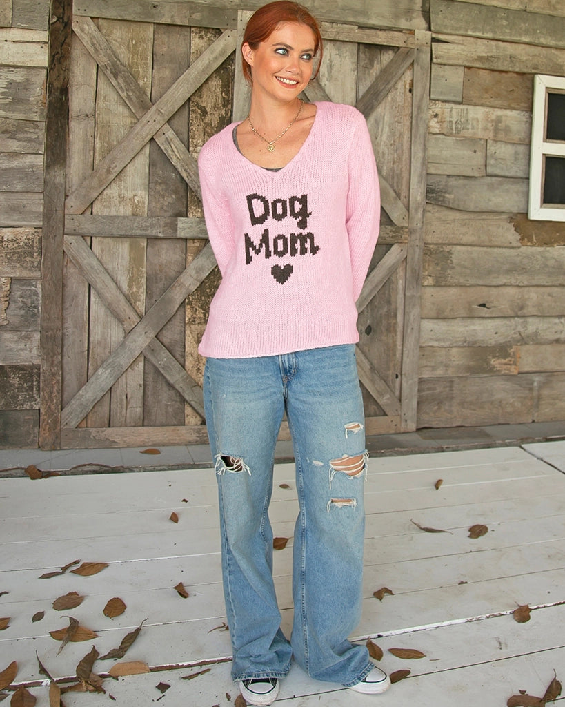Made from a soft and cozy knit blend, this sweater features the words “Dog Mom” with a mini heart at the center front. Designed with a flattering V-neckline, shirt-tail hem with a single-stitch finish, and side slits for easy movement, it’s a perfect everyday piece for comfort and style.