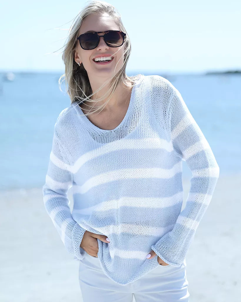 This hoodie is super soft and light, feeling comfortable directly against the skin. Knitted using our soft, ropey, and breathable cotton blend yarn featuring nautical stripes, this tunic-length V-neck has a flattering, relaxed fit. Details include a rounded hem with side slits, making this top incredibly versatile.