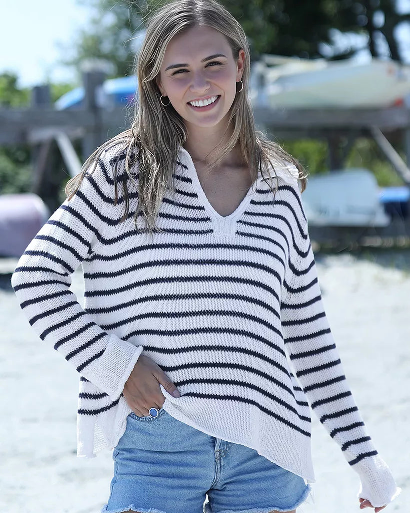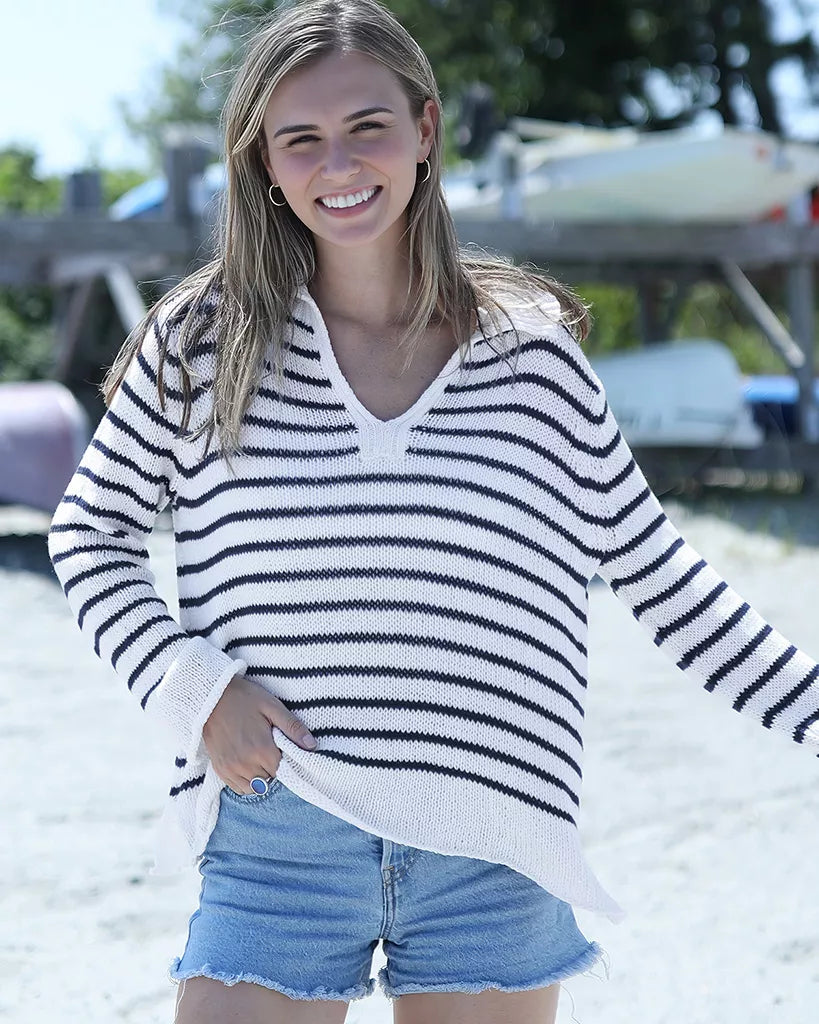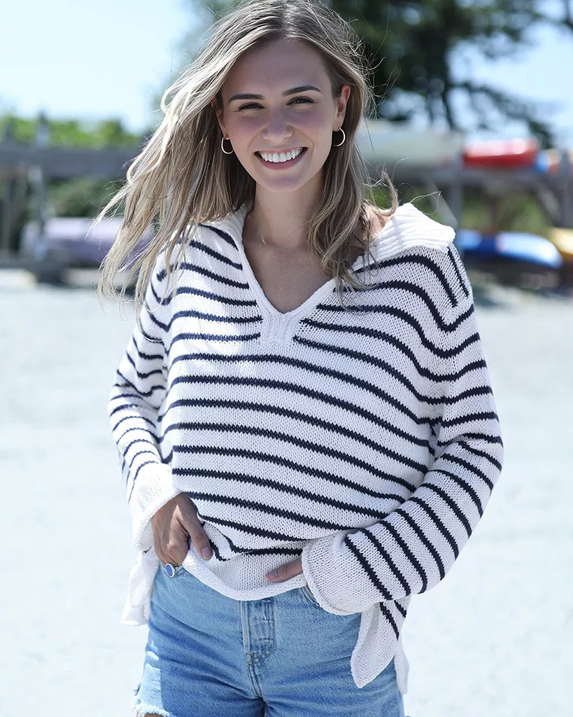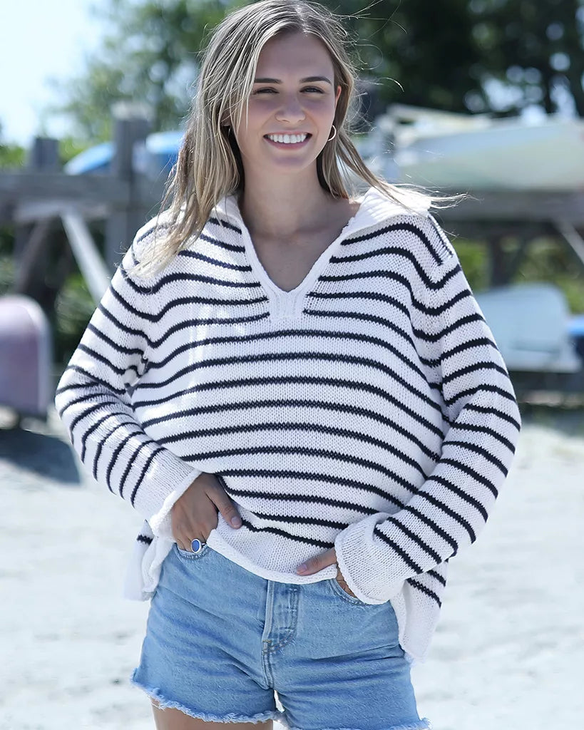Crafted from our signature cotton-blend yarn, it features stripes throughout and an open-knit construction that keeps things airy and perfect for layering. The ribbed collar neckline adds a sporty, polished touch, while inset long sleeves and a relaxed fit make it an easy go-to from morning errands to late-day plans.