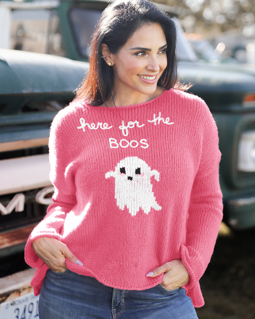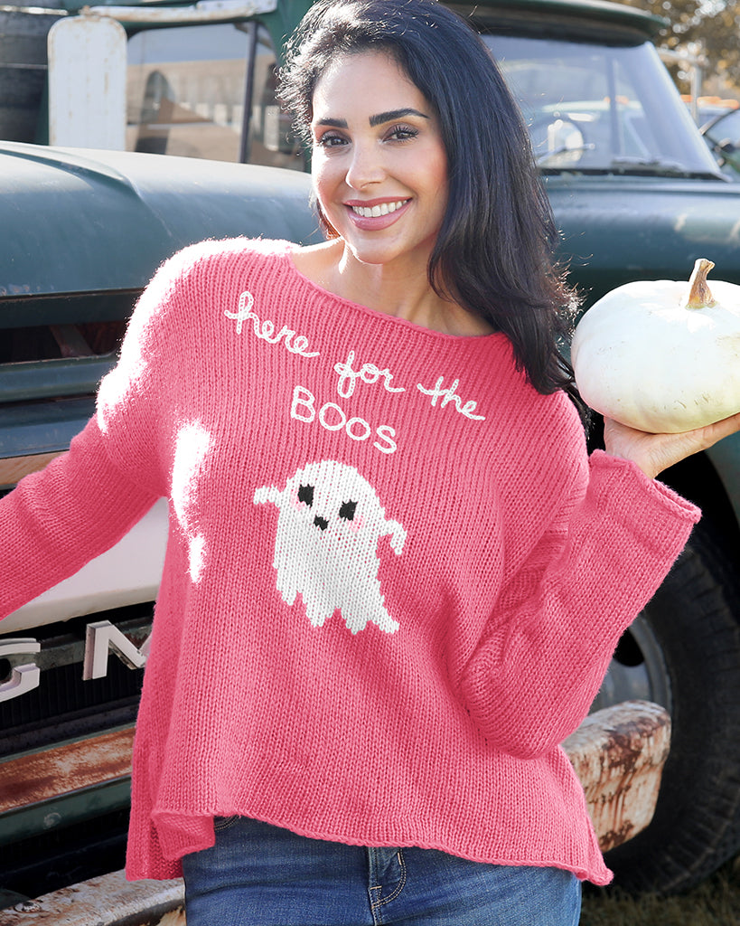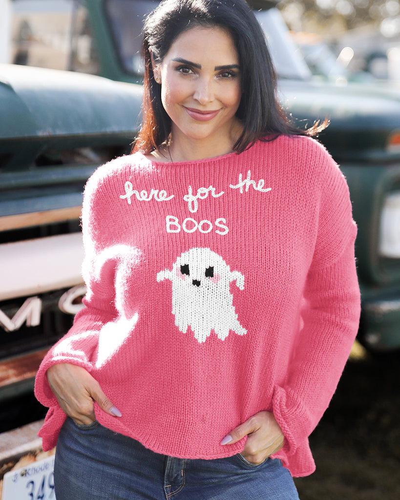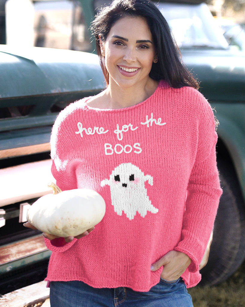 This oh-so-soft and lightweight crew is the perfect addition to your spooky season wardrobe. This comfy top features a cute ghost graphic and the phrase 'Here for the BOOS' embroidered by hand on the center front. The fitted sleeves and oversized body are super flattering and dropped shoulders add extra slouch. Mini side slits have been added to the hem. The perfect top for a Halloween happy hour!