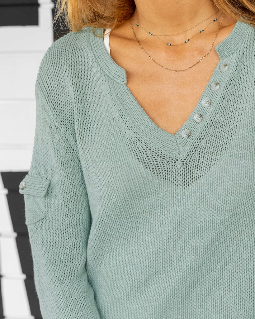 Effortlessly chic, this top is knit with our super-soft cotton yarn for lightweight comfort. Featuring a flattering V-neckline with button details and decorative chest pockets on the sleeves, it combines classic elements with modern style. Ideal for casual days or evenings out, this versatile piece is sure to become a wardrobe favorite.