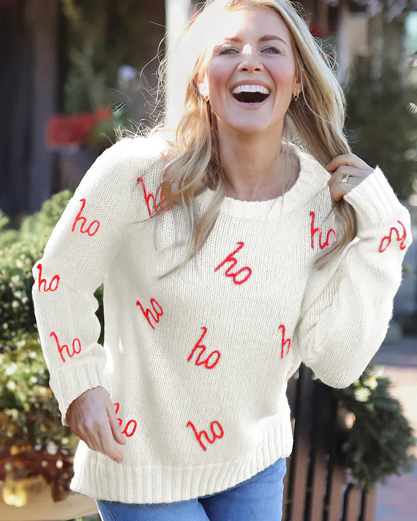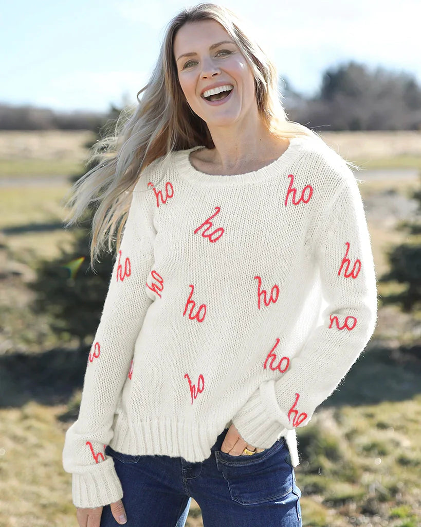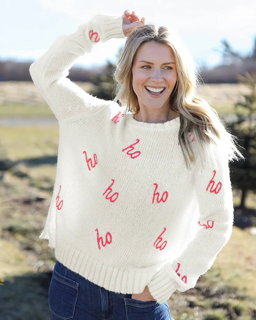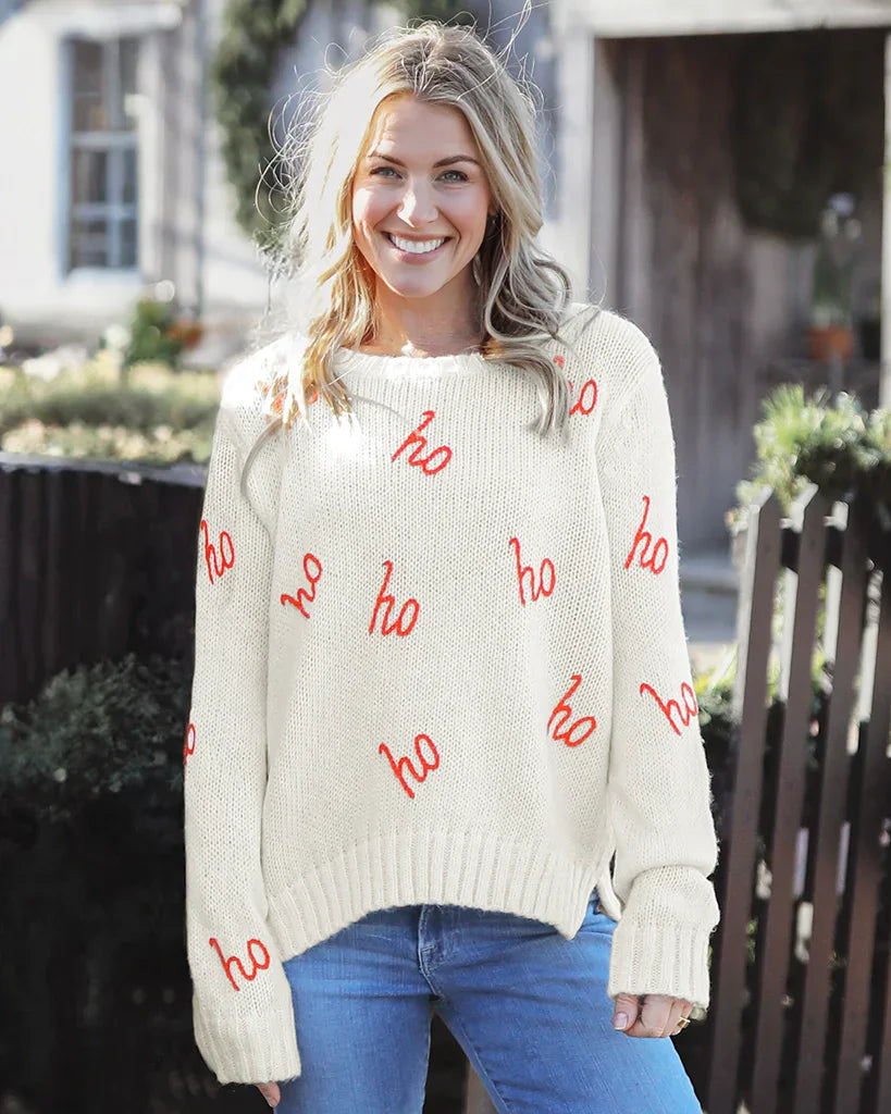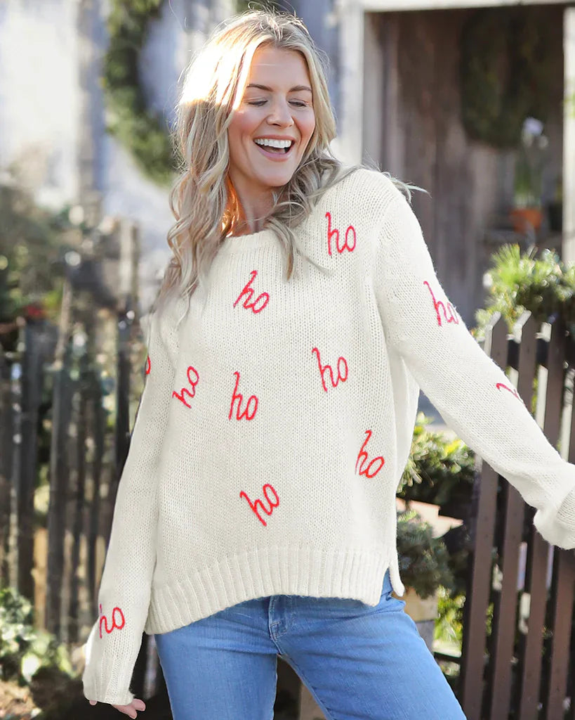 Incredibly soft to the touch, this crewneck is knit in a flattering, relaxed fit that will keep you cozy all season long. The playful "Ho Ho Ho" slogan is hand-embroidered and spread across the sweater. Details include a ribbed neckline, cuffs, and hem, with mini side slits at the hem.