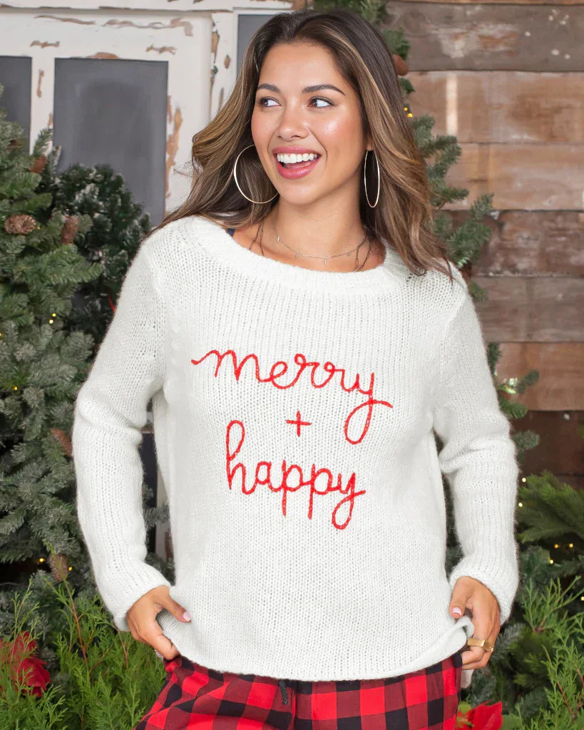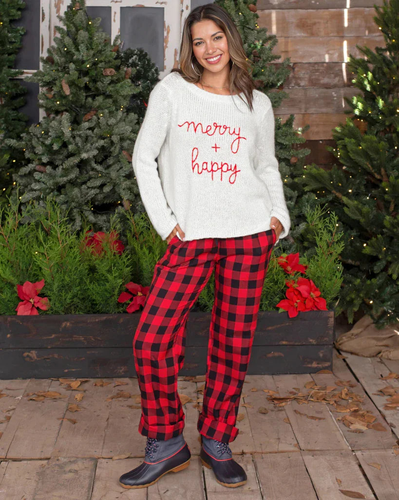 The perfect sweater for Christmas parties and pictures! Incredibly soft and cozy crew featuring holiday themed words hand embroidered onto the center front. Super flattering boxy fit body with a slight crop.