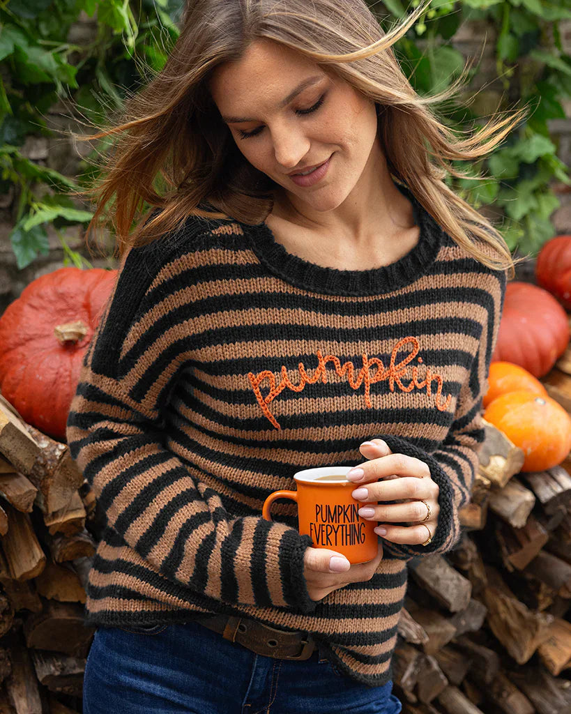 Made from our super soft, signature wool blend yarn, this sweater features a ribbed crewneck, rolled edge cuffs, and a single-stitched finish at the hem. The classic striped design is elevated with the word "pumpkin" embroidered at the center front, creating a playful and cozy look — perfect for the fall season.