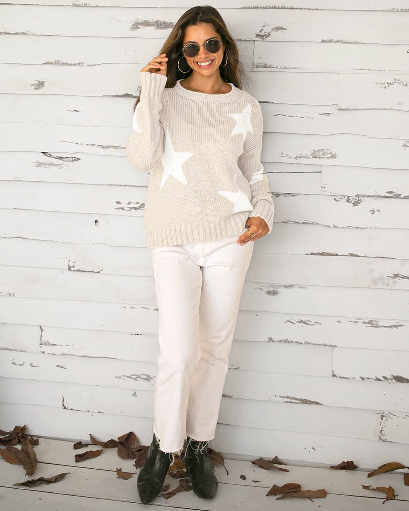 A must-have boyfriend crew, this sweater is super soft and knit in a flattering, relaxed fit. It features a star graphic knit into the body and sleeves. Details include ribbed finishes on the neckline, cuffs, and hem. The dropped shoulders add extra slouch and enhance the relaxed fit.