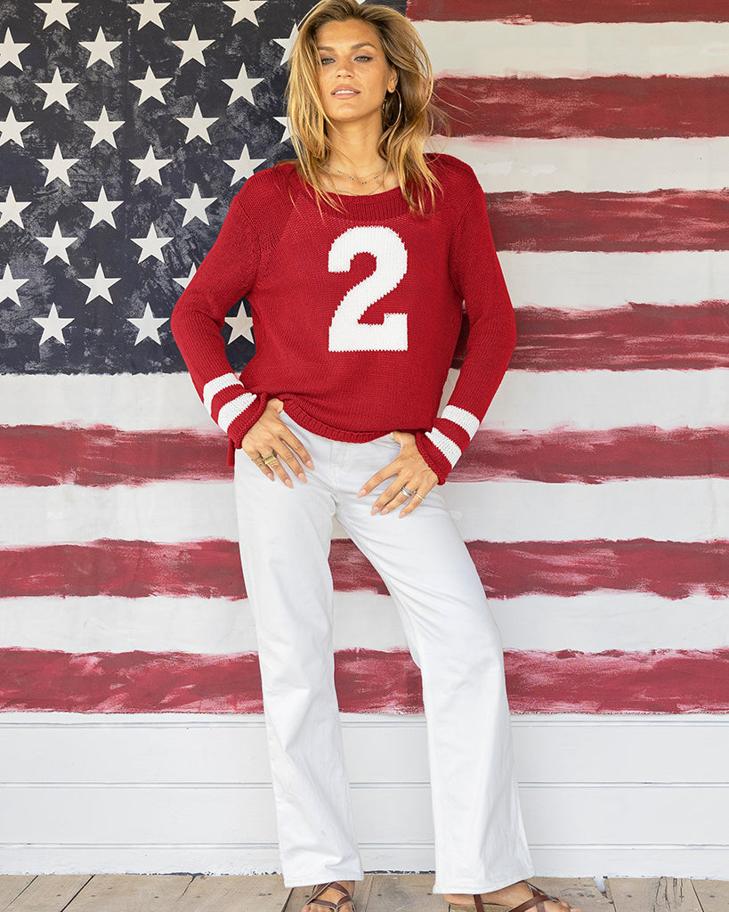 The perfect customizable top ideal for any game day! Support your favorite player with this super soft, lightweight, and slightly slim fit crewneck with one digit number "2", knit directly into the front of the sweater.