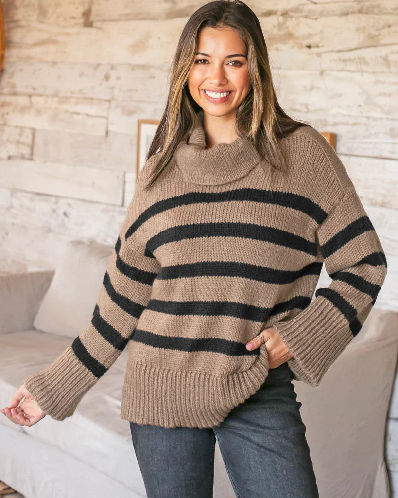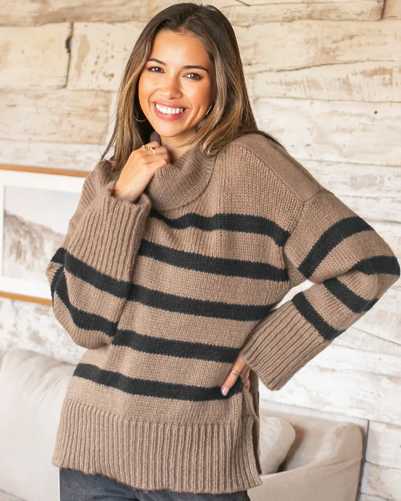 This standout piece features classic stripes across the body and sleeves, delivering a timeless, eye-catching look. The turtleneck adds extra coziness, while the dropped shoulders and chunky ribbed hem and cuffs enhance the relaxed fit. Mini side slits add a stylish detail. The chunky knit texture adds a playful touch and plush feel, making it perfect for cooler days.