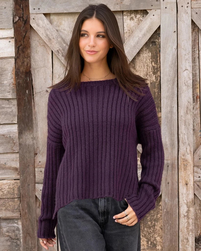 Stylish and modern, this relaxed-fit sweater is made with our buttery-soft wool blend yarn, giving it a cozy chunky texture. Designed with a classic crew neckline, dropped shoulders, ribbed finishes, and subtle side slits, it delivers an effortless laid-back look with a touch of chic.