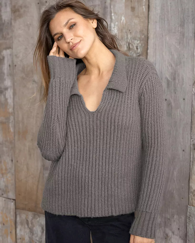 This beautiful polo V-neck style is perfect for warmer days. Crafted with meticulous attention to detail, this sweater is knit with a shaker stitch that adds chunkiness and texture to the classic silhouette. Additional details include a ribbed construction on the hem and cuffs.