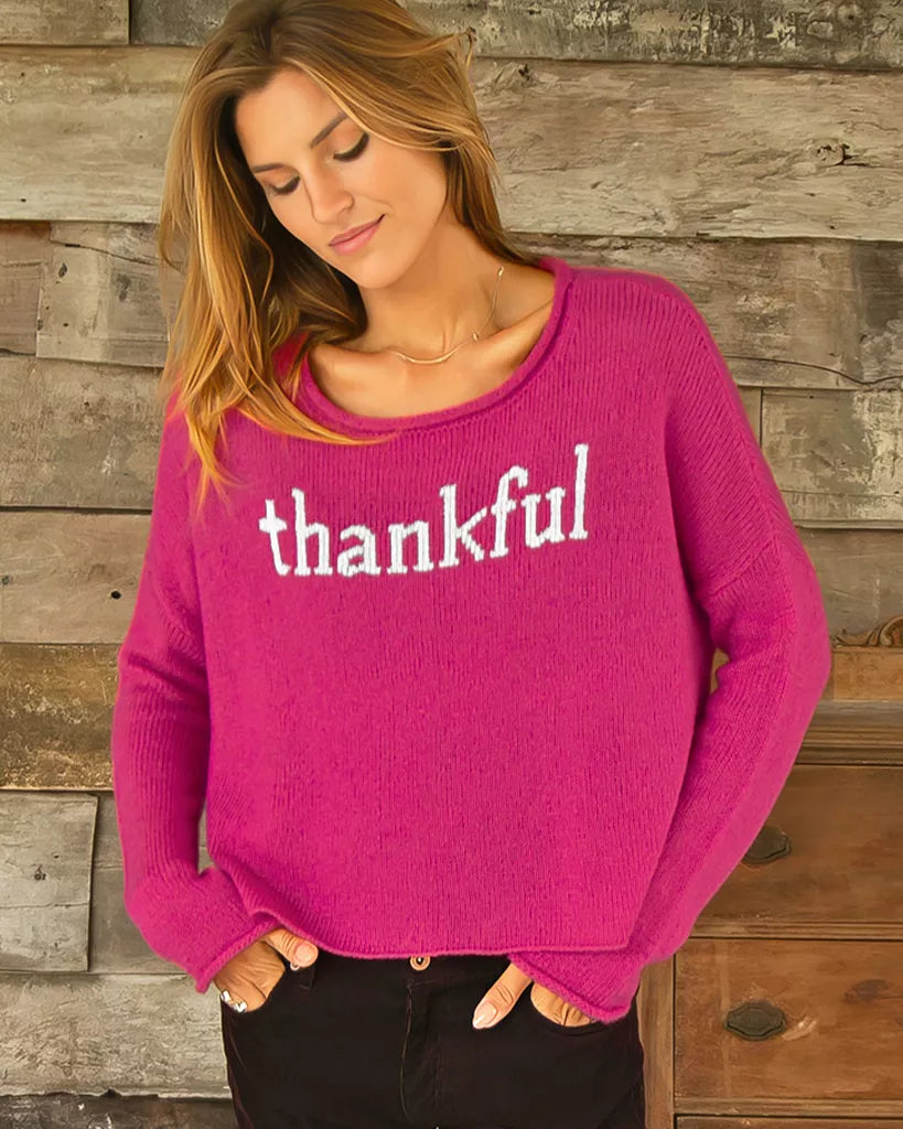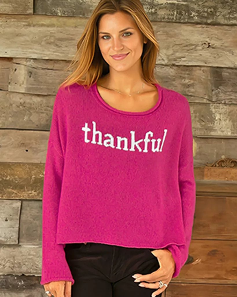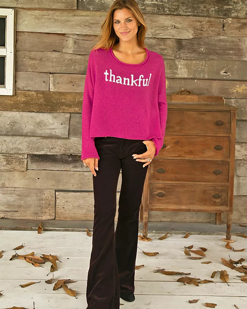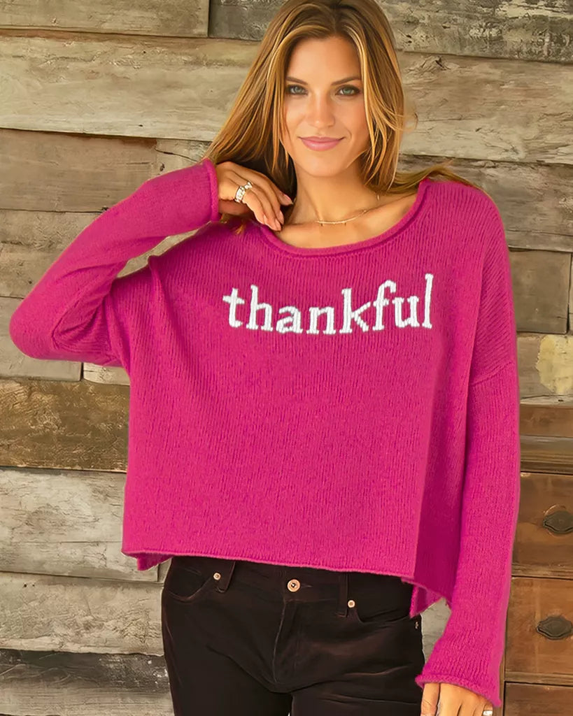 Buttery soft and cozy, this cropped crew features the word 'thankful' knitted directly into the center front, making it the perfect choice for your Thanksgiving outfit. Details include a rolled neckline and cuffs, side slits at the hem, and dropped shoulders, adding extra slouch and creating a casual vibe.