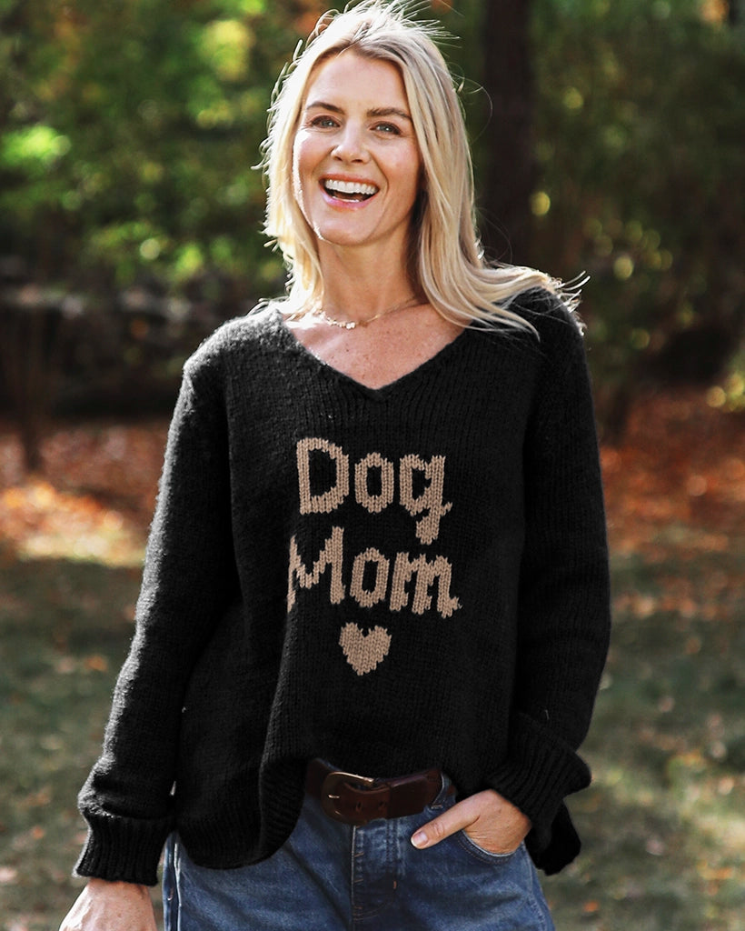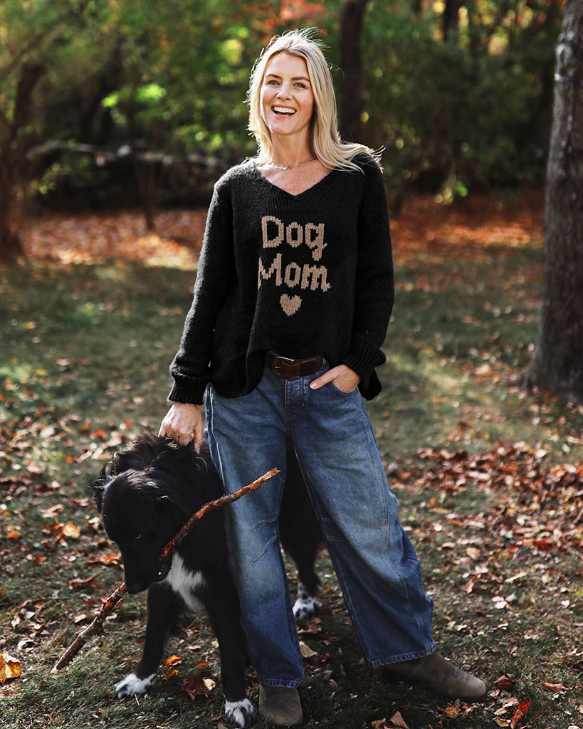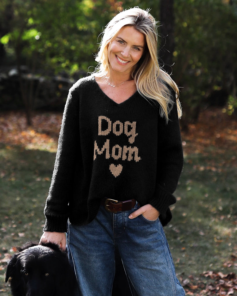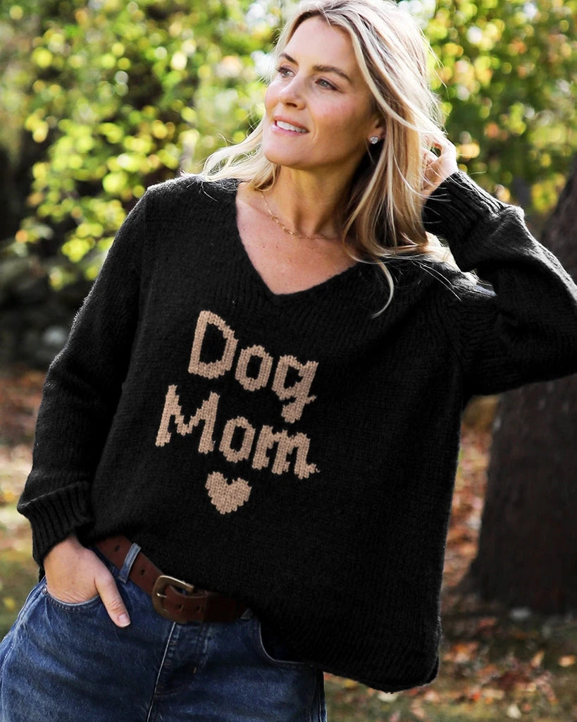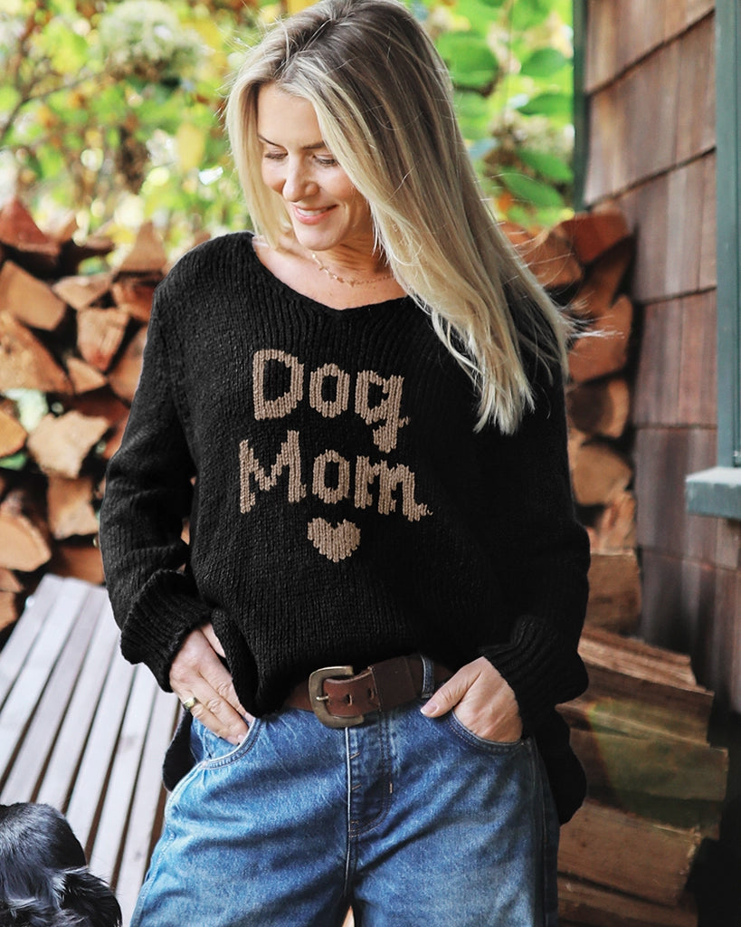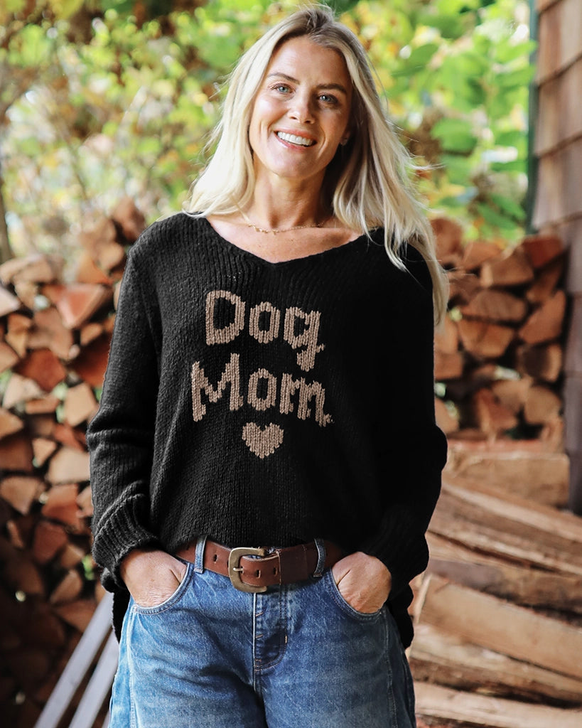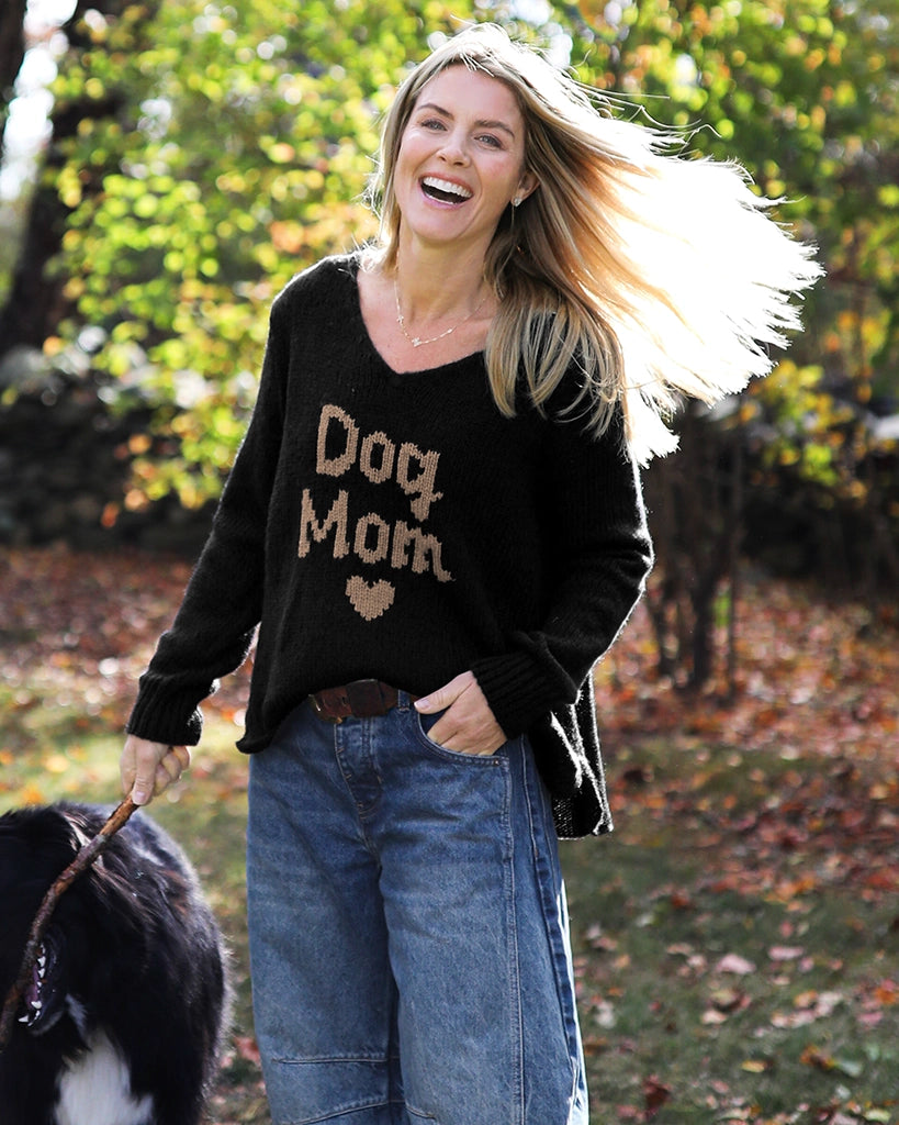 Super soft and buttery, this cozy knit features the words "Dog Mom" with a mini heart knit directly into the center front. It's slightly cropped for a flattering fit and is relaxed, with the perfect amount of slouch. Details include a shirt-tail hem with a single-stitch finish and side slits.